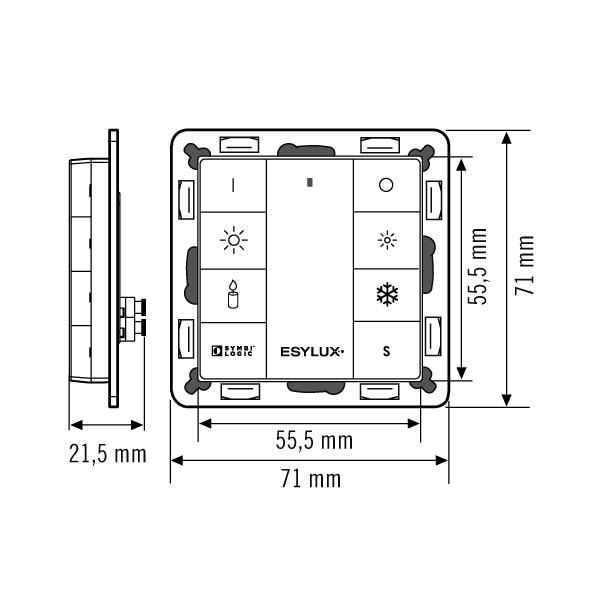 - Permet les commandes suivantes: marche/arrêt, augmentation/diminution de l'intensité lumineuse, l'appel de scènes (ambiances) et la remise en mode automatique