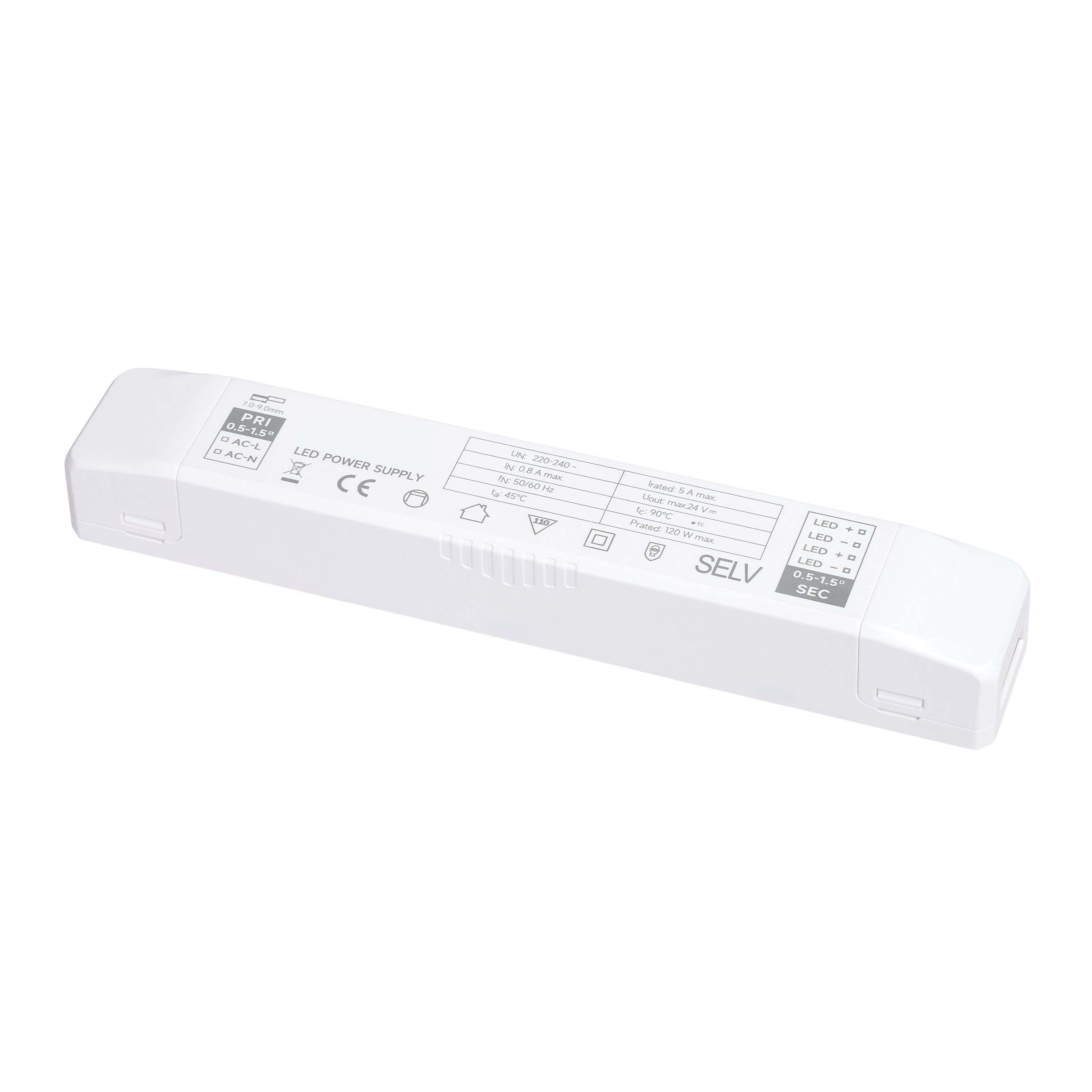 Alimentation EUROPOLE IZI'TRONIC 24 120W. Convertisseur électronique pour éclairage LED tension constante. Tension d'entrée : 220-240VAC. Tension de sortie : 24VDC. Courant d'entrée : 0,8A. Courant de sortie : 5A. Classe de protection : II, IP20. Non dimmable. Nombre d'entrée(s) primaire(s) : 1, nombre de sorties physiques : 2. Températures de fonctionnement : -20°C/+45°C.