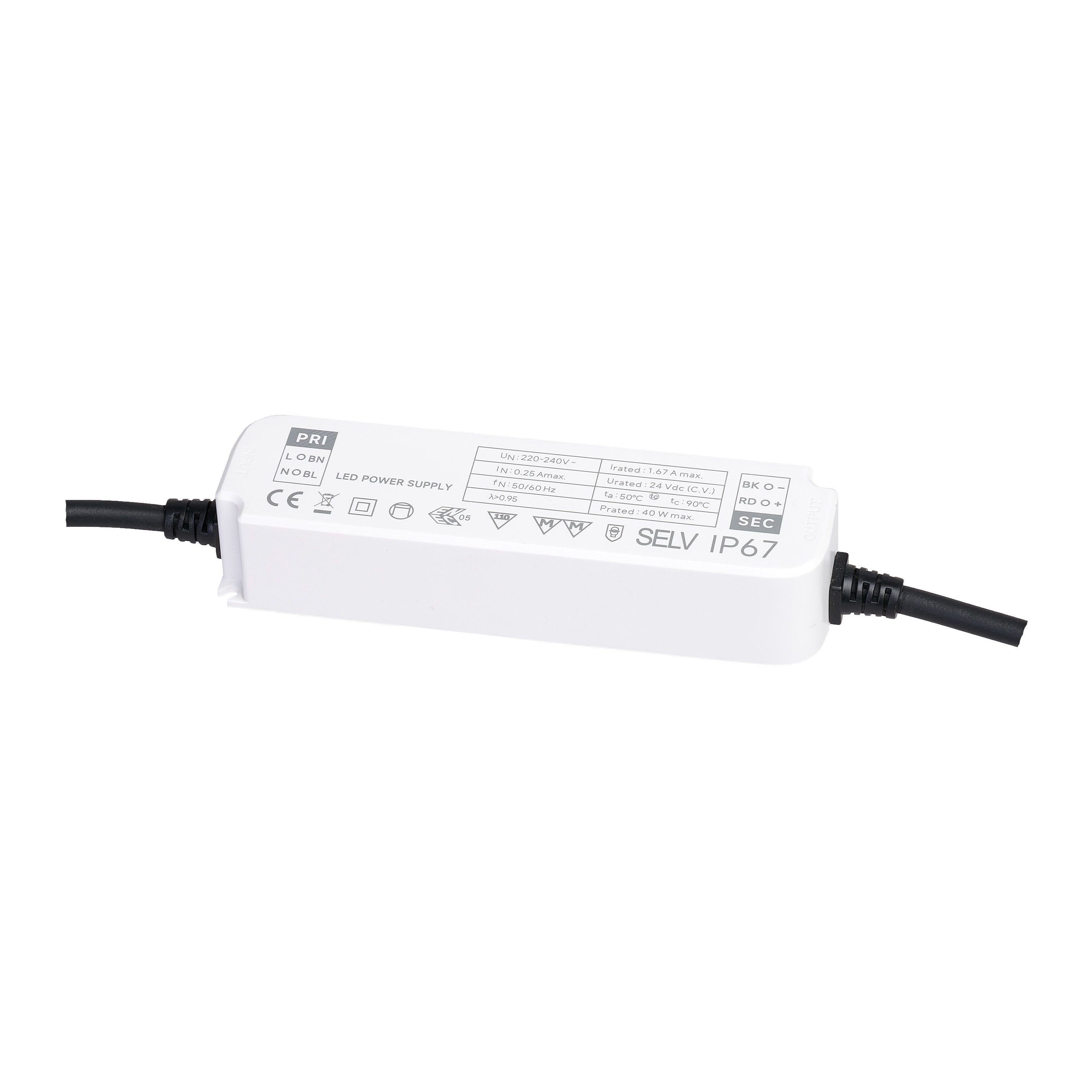 Alimentation IZI'TRONIC 24 40W. Convertisseur électronique pour éclairage LED tension constante. Entrée : 220-240VAC. Sortie : 24VDC/1,67A. Classe II, IP67, câblé de 0,3m. Non dimmable.