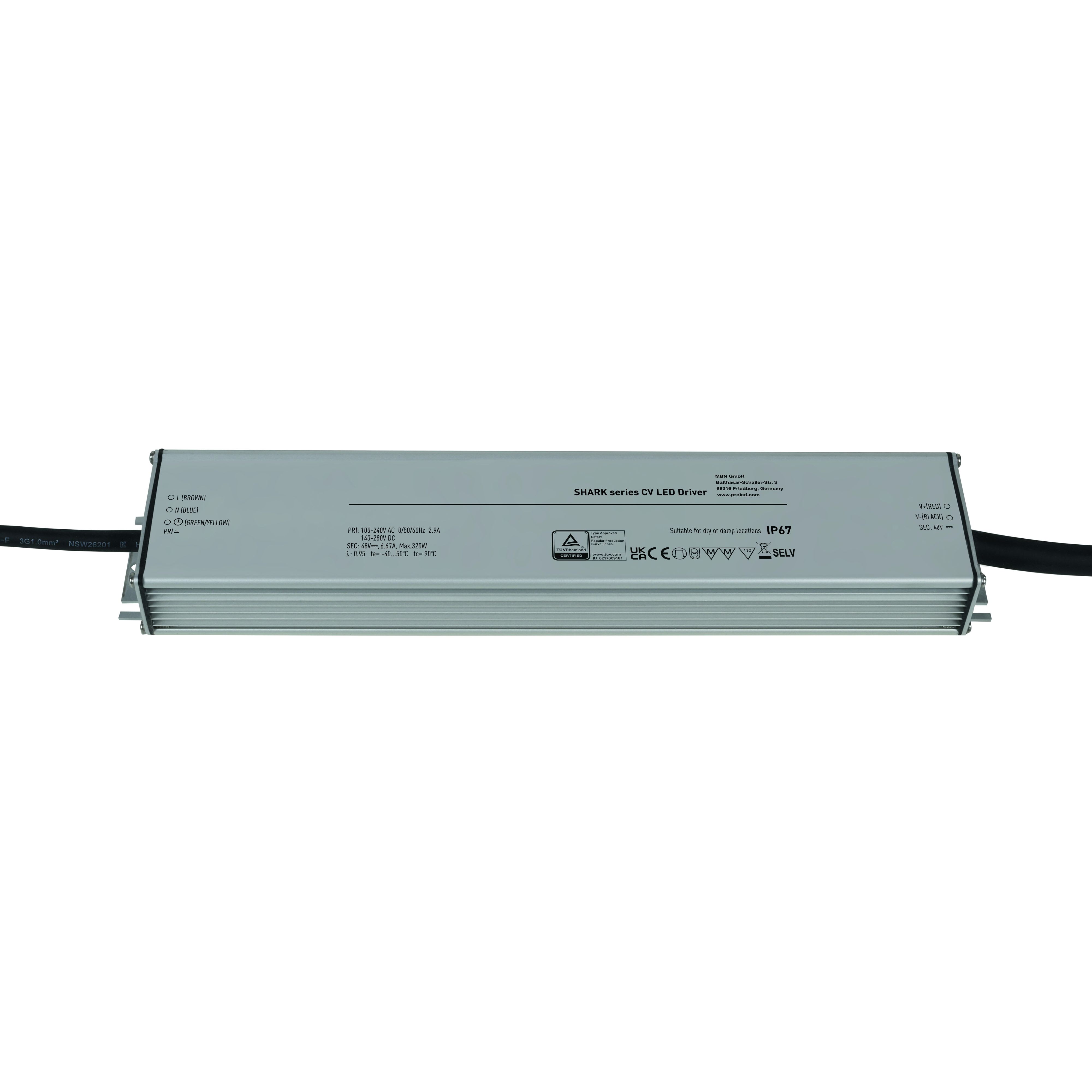 Alimentation EUROPOLE LED'TRONIC 48 320W. Convertisseur électronique pour éclairage LED tension constante. Tension d'entrée : 230VAC. Tension de sortie : 48VDC. Courant d'entrée : . Courant de sortie : 6,7A. Classe de protection : I, IP67, câblé de 0,25m, prim : H05RN-F 3x1mm²/sec : H07RN-F 2x2,5mm². Non dimmable. Nombre d'entrée(s) primaire(s) : 1, nombre de sorties physiques : 1. Températures de fonctionnement : -40°C/+50°C.