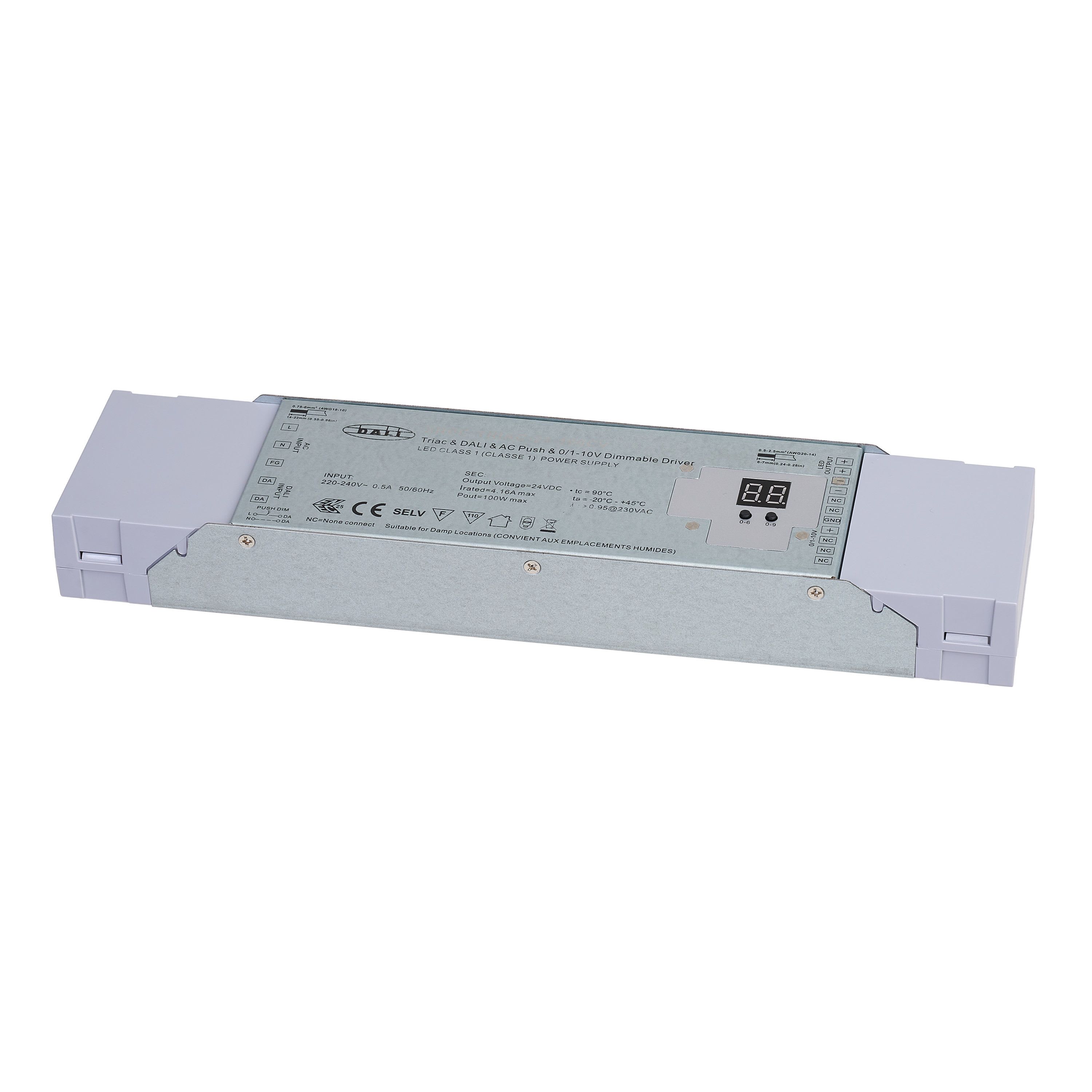 Alimentation SMART 4IN1 24 100W. Convertisseur électronique pour éclairage LED tension constante et variation d'intensité lumineuse. Entrée : 220-240VAC. Sortie : 24VDC/4,16A. Classe I, IP20. Dimmable, variation TRIAC/DALI/Push/0-10V/1-10V