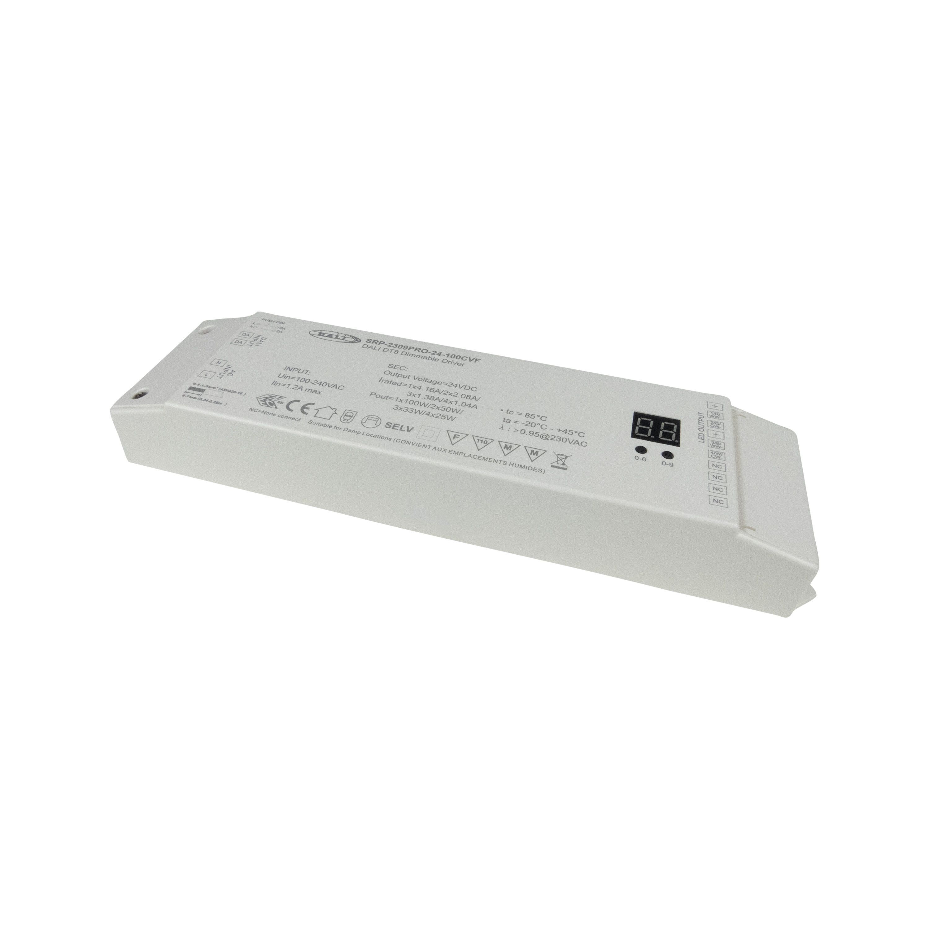 Alimentation EUROPOLE SMART DALI 24 100W. Convertisseur électronique pour appareil LED monochromes, TW, RGB ou RGBW : variation d'intensité lumineuse, changement de température de couleur et de couleur de LED. Tension d'entrée : 100-240VAC. Tension de sortie : 24VDC. Courant d'entrée : 1,2A. Courant de sortie : 4,16A. Classe de protection : II, IP20. Dimmable : Oui, variation DALI. Protocole utilisé : DALI DT8, interface de communication : DALI, transmission de signal : Filaire. Nombre d'entrée(s) primaire(s) : 1, nombre de sorties physiques : 4. Températures de fonctionnement : -20°C/+40°C.