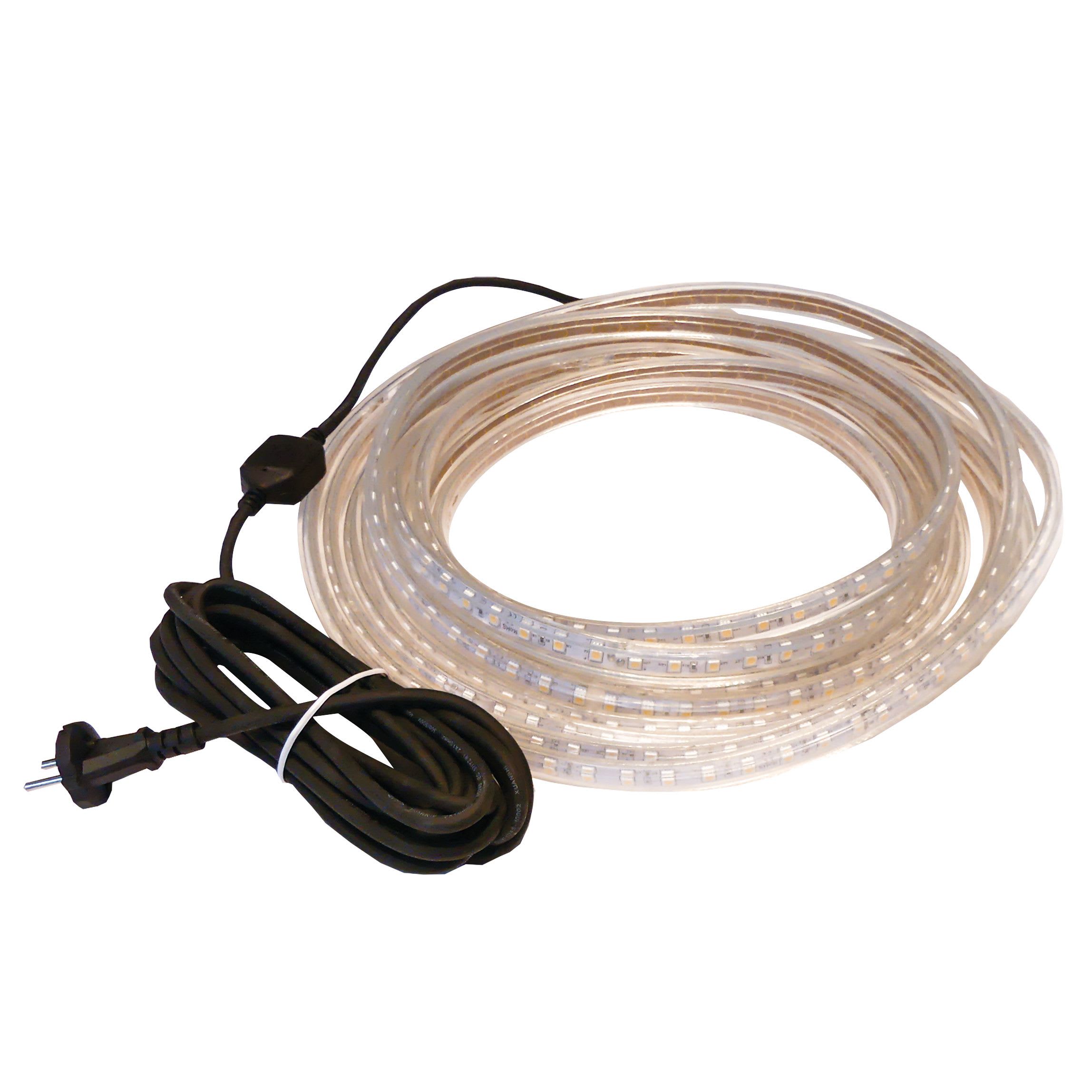 Bandeau Led EUROPOLE 25m WORKFLEX, blanc 4000K, IRC>80, SDCM5, 5.5W/m, 517lm/m (94lm/W), 60LED/m, optique 120°, 230VAC. Classe de protection II. Non sécable. IP65, câblé de 1m avec prise mâle 2P, HO5RN-F, durée de vie : 20000h. Dimmable : Non. Idéal pour l'éclairage chantier.