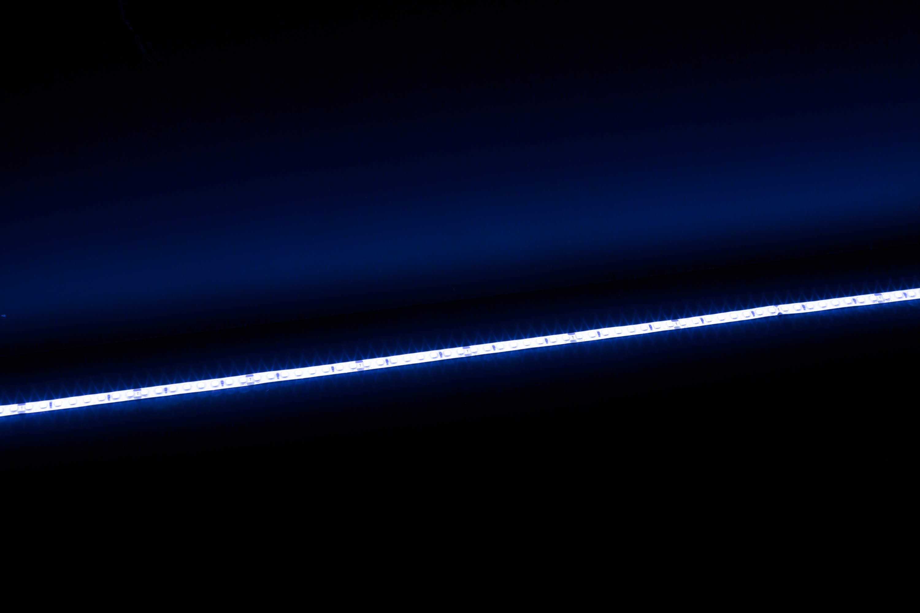 Bandeau Led EUROPOLE 1m VOLTA PRO 4,8W/m IP42 : bleu 4,8W/m, 140lm/m (29lm/W), 128LED/m, 24VDC. Largeur du bandeau : 8mm. Classe de protection III. Sécable tous les 62,5mm. IP42, câblé des 2 côtés 0,5m, 20AWG 2x0,5mm², durée de vie : 50000h. Dimmable : oui, variation avec alimentation/contrôleur compatible (non inclus). Installation sur profil aluminium impérative.
