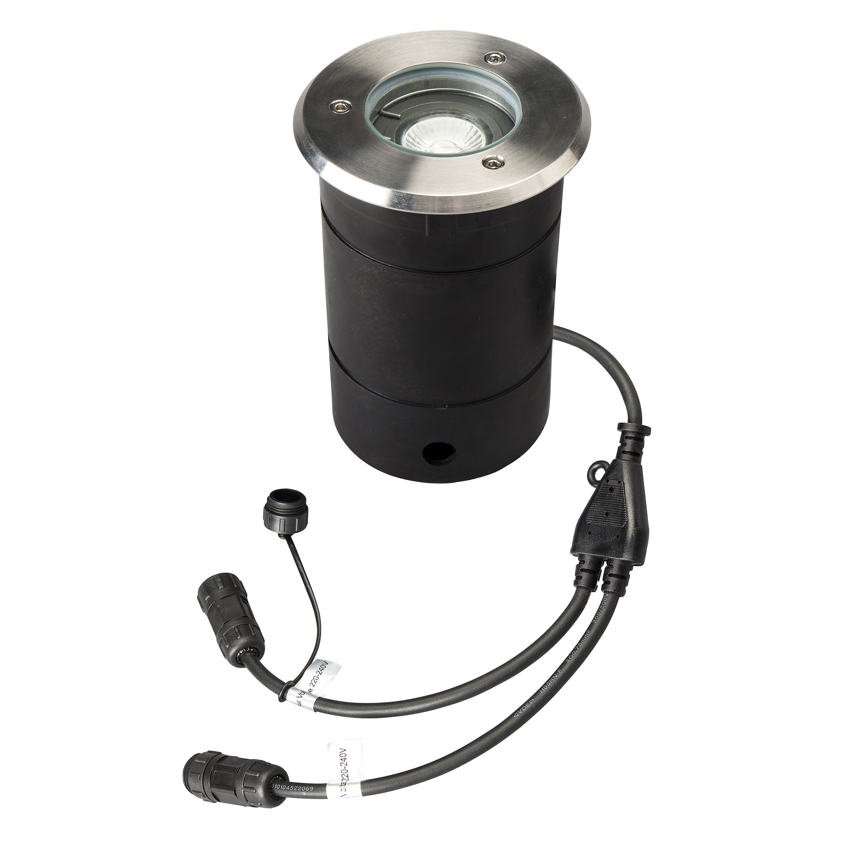 Encastré de sol EUROPOLE BOUNTY 2 LED EVO rond inox, blanc 3000K, IRC90, 6W, 500lm (83,33lm/W), verres opale et transparent 48° (éclairage), 230VAC. Classe de protection I, IP65, IK08, câblé de 0,3m avec connectiques rapides Y IP68 Plug & Play mâle et femelle, HO5RN-F 3x0,75mm². Durée de vie : 20000h. Dimmable : Non. Dimension collerette : diamètre 100mm. Diamètre d'encastrement : 78mm. Matériau : collerette en inox 316L. Traitement de la surface : traitement par passivation. Températures de fonctionnement : -20°C/+40°C. Walkover : Oui. Driveover : non. Submersible : Non. Diamètre de découpe indiqué pour installation sans pot d'encastrement.