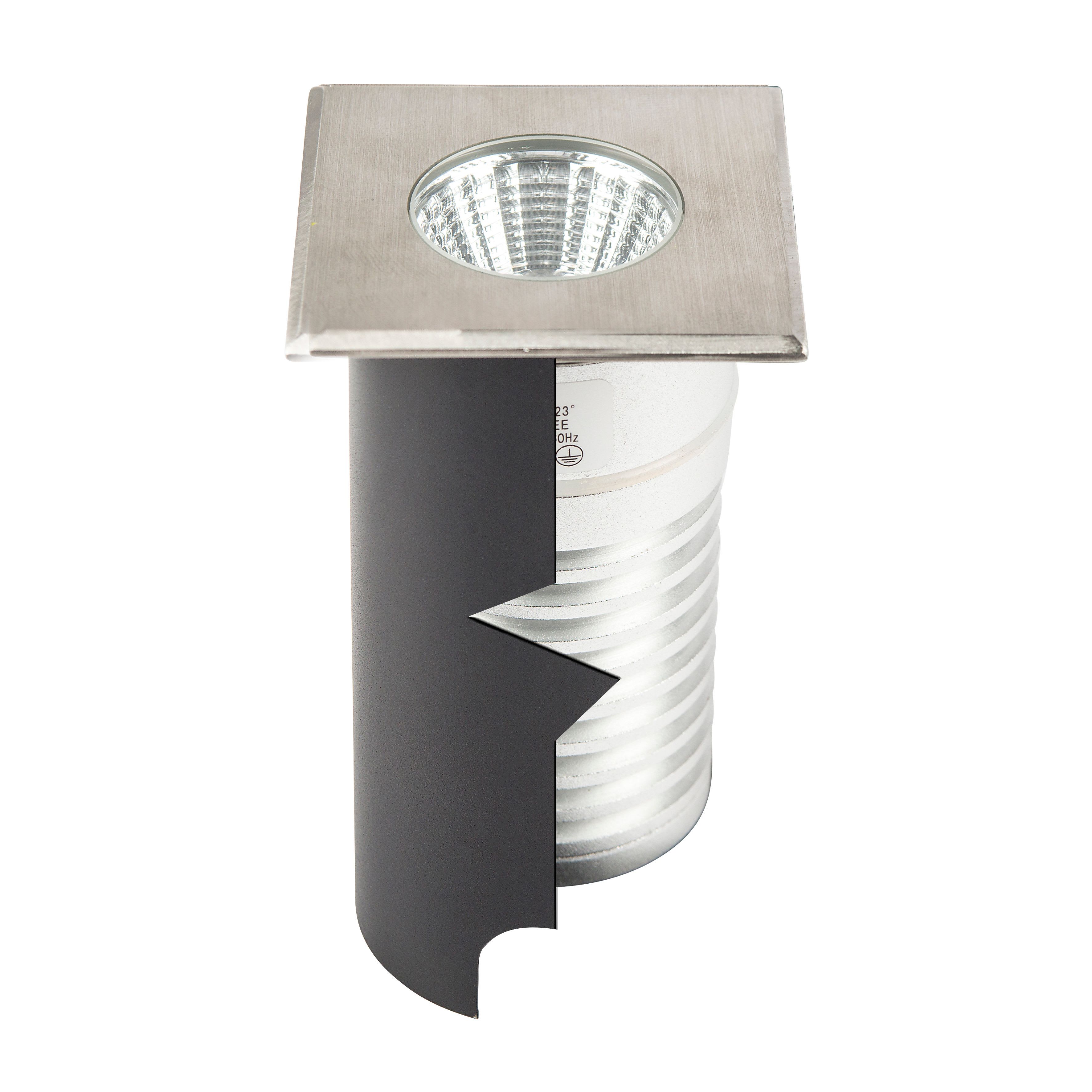 Encastré de sol COLOSS 1 - 230 carré : 60x60mm, inox brossé, blanc 3000K, IRC>80, 5W, 460lm (92lm/W), optique faible éblouissement 23° (éclairage), 230VAC. Classe I, IP67. IK08. Non dimmable.
