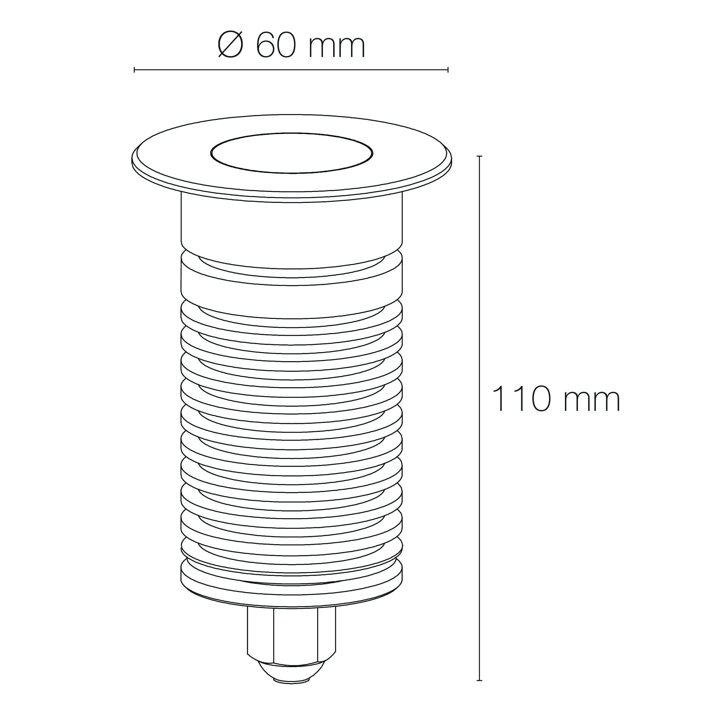 Encastré de sol EUROPOLE COLOSS 1 - 230 rond inox brossé, blanc 4000K, IRC>80, 5W, 500lm (100lm/W), optique faible éblouissement 23° (éclairage), 230VAC. Classe de protection I, IP67, IK08, câblé de 0,5m avec connectiques rapides IP68 Plug & Play mâle et femelle, HO5RN-F 3x0,75mm². Durée de vie : 30000h. Dimmable : Non. Dimension collerette : diamètre 60mm. Diamètre d'encastrement : 52mm. Matériau : corps en aluminium/collerette et visserie inox 316L. Traitement de la surface : corps traité anticorrosion. Températures de fonctionnement : -20°C/+40°C. Walkover : Oui. Driveover : non. Submersible : Non. Diamètre de découpe indiqué pour installation sans pot d'encastrement.