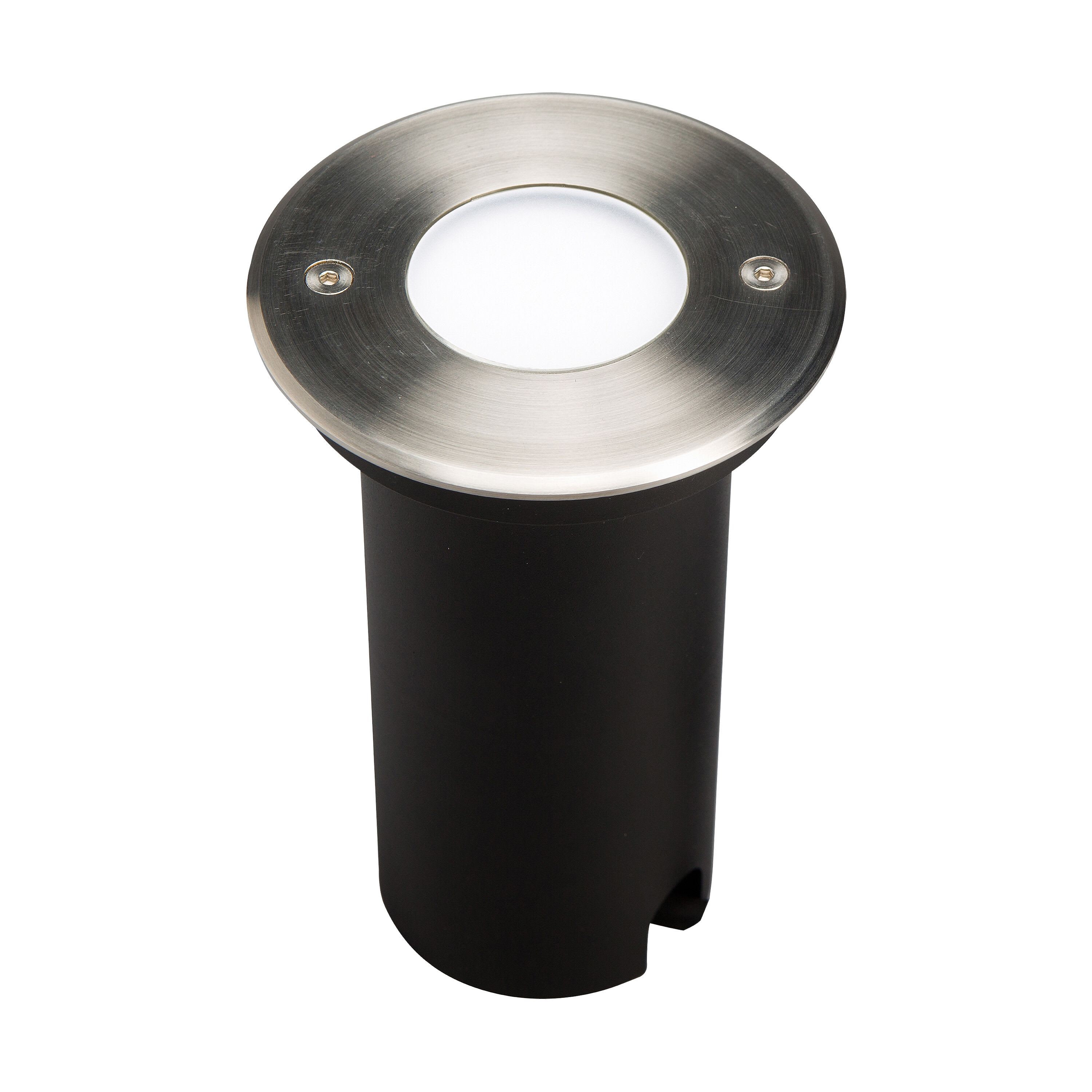 Encastré de sol COLOSS 2 - 230 rond : 95mm, inox brossé, blanc 3000K, IRC>80, 10W, 347lm (34,7lm/W), verre opale 120° (balisage), 230VAC. Classe I, IP67. IK08. Non dimmable.