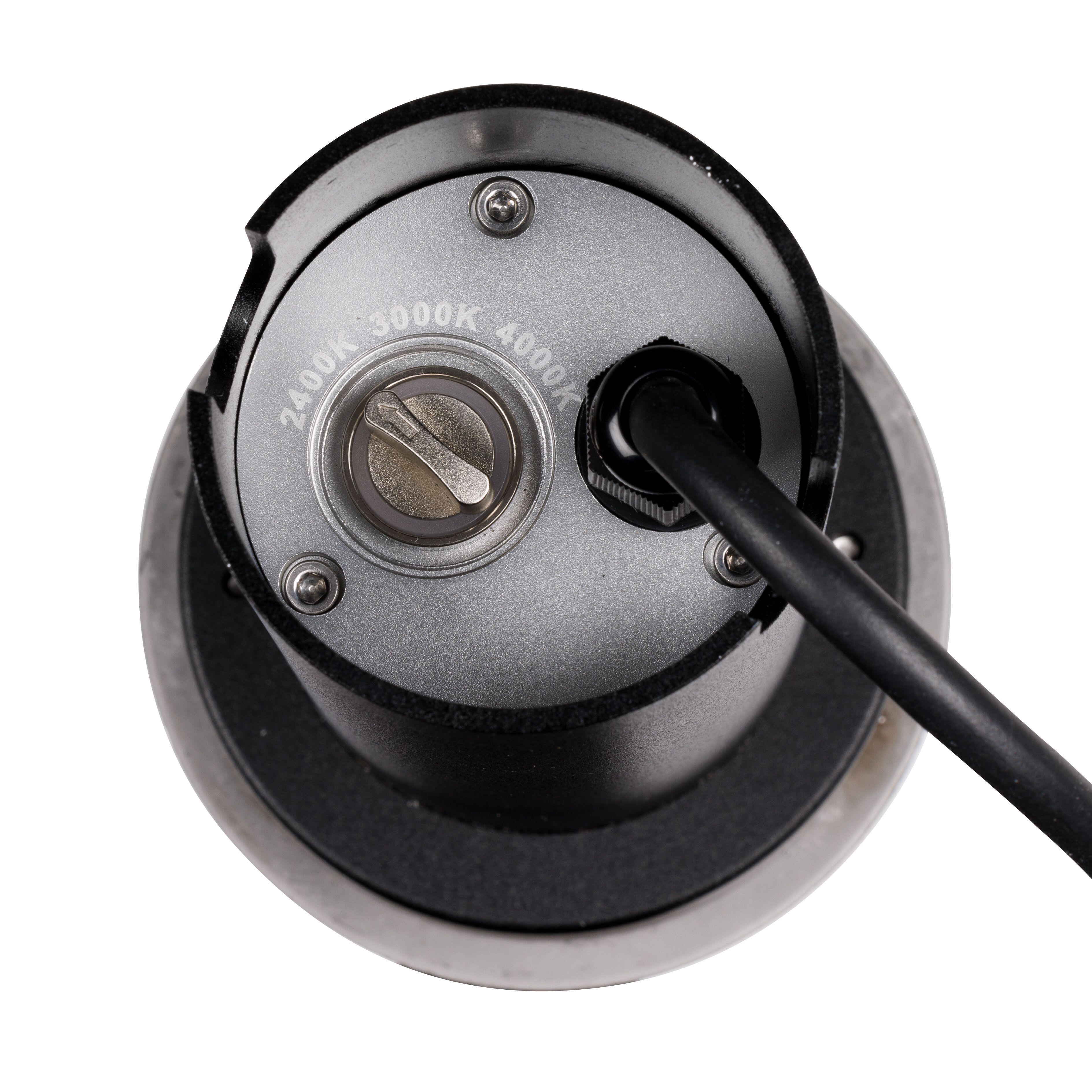 Encastré de sol EUROPOLE COLOSS 2 SWITCH - 230 rond inox brossé, blanc 2400K/3000K/4000K, IRC>80, 10W, 1000/1090/1140lm (114lm/W), optique faible éblouissement 23° (éclairage), 230VAC. Classe de protection I, IP67, IK08, câblé de 0,5m avec connectiques rapides IP68 Plug & Play mâle et femelle, HO5RN-F 3x0,75mm². Durée de vie : 30000h. Dimmable : Non. Dimension collerette : diamètre 95mm. Diamètre d'encastrement : 85mm. Matériau : corps en aluminium/collerette et visserie inox 316L. Traitement de la surface : corps traité anticorrosion. Températures de fonctionnement : -20°C/+40°C. Walkover : Oui. Driveover : Non. Submersible : Non. Diamètre d'encastrement indiqué pour installation sans pot d'encastrement. Réglage de la température de couleur via commutateur. Flicker free : Oui