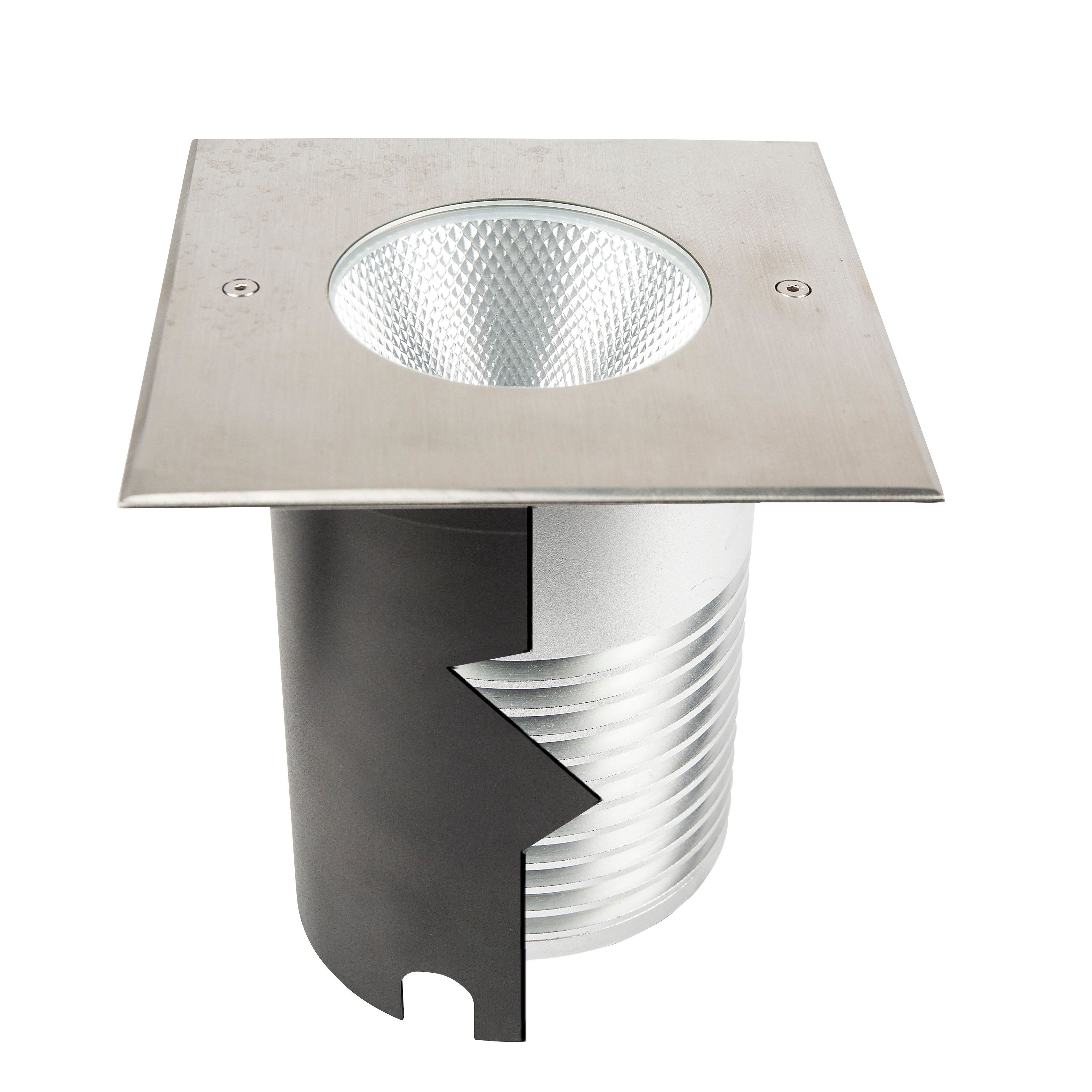 Encastré de sol EUROPOLE COLOSS 4 - 230 carré inox brossé, blanc 3000K, IRC>80, 20W, 1930lm (96,5lm/W), optique faible éblouissement 23° (éclairage), 230VAC. Classe de protection I, IP67, IK08, câblé de 0,5m avec connectiques rapides IP68 Plug & Play mâle et femelle, HO5RN-F 3x0,75mm². Durée de vie : 30000h. Dimmable : Non. Dimension collerette : 165x165mm. Diamètre d'encastrement : 142mm. Matériau : corps en aluminium/collerette en inox 316L. Traitement de la surface : corps traité anticorrosion. Températures de fonctionnement : -20°C/+40°C. Walkover : Oui. Driveover : non. Submersible : Non. Diamètre de découpe indiqué pour installation sans pot d'encastrement.