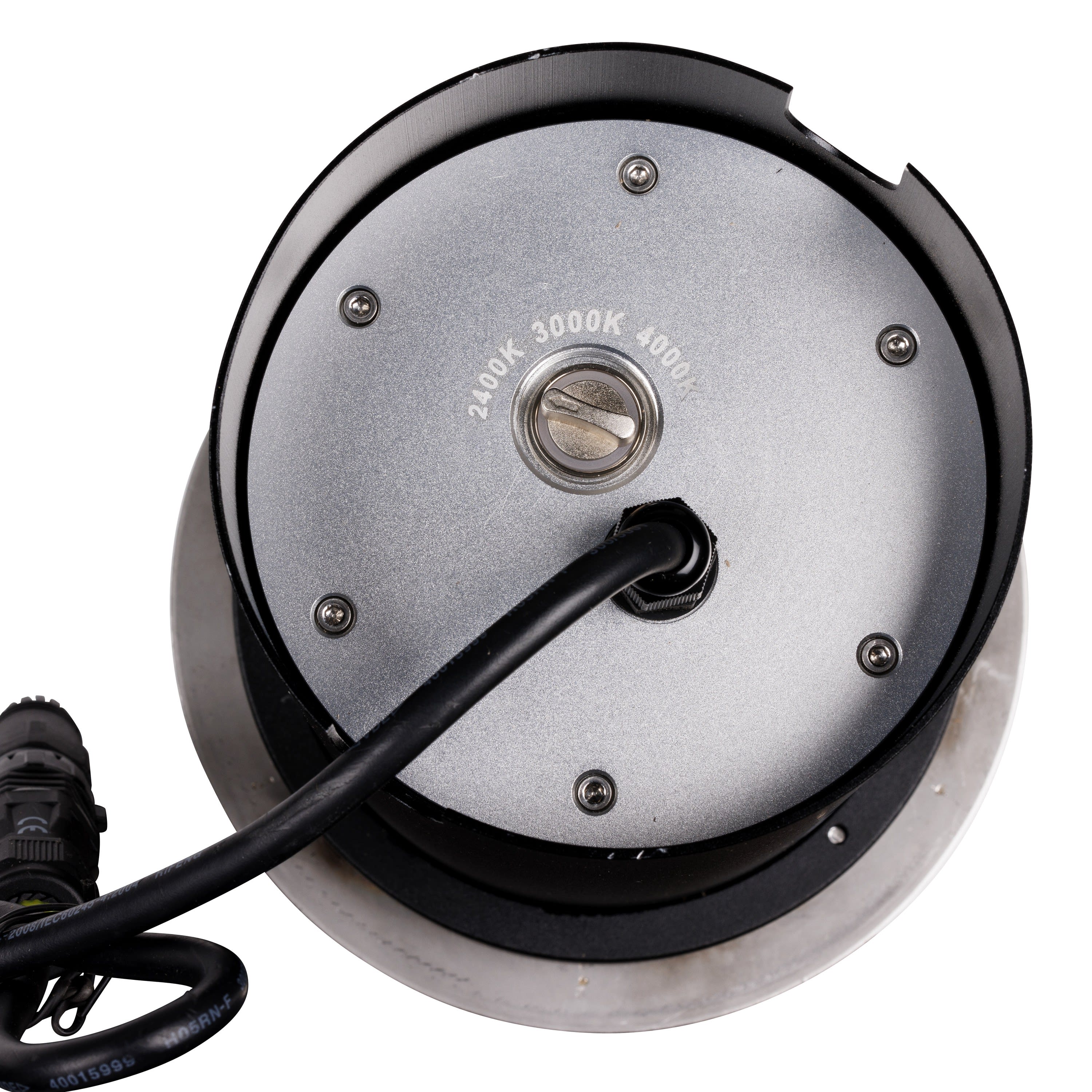 Encastré de sol EUROPOLE COLOSS 4 SWITCH - 230 carré inox brossé, blanc 2400K/3000K/4000K, IRC>80, 20W, 1900/2100/2160lm (108lm/W), optique faible éblouissement 23° (éclairage), 230VAC. Classe de protection I, IP67, IK08, câblé de 0,5m avec connectiques rapides IP68 Plug & Play mâle et femelle, HO5RN-F 3x0,75mm². Durée de vie : 30000h. Dimmable : Non. Dimension collerette : 165x165mm. Diamètre d'encastrement : 142mm. Matériau : corps en aluminium/collerette et visserie inox 316L. Traitement de la surface : corps traité anticorrosion. Températures de fonctionnement : -20°C/+40°C. Walkover : Oui. Driveover : Non. Submersible : Non. Diamètre d'encastrement indiqué pour installation sans pot d'encastrement. Réglage de la température de couleur via commutateur. Flicker free : Oui