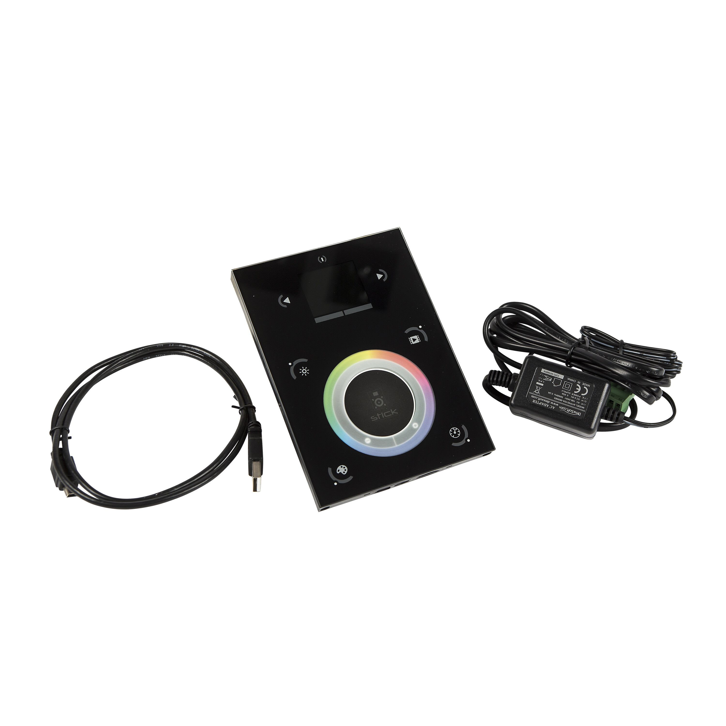 Commande murale tactile DMX 512 : deux univers de 512 adresses DMX, création jusqu'à 10 zones et 500 scènes programmables. DMX MASTER EUROPOLE noir IP20. Nombre de zones indépendantes : 10. Nombre de canaux : 1024. Tension d'entrée : 6VDC. Classe de protection : III. Dimmable : Oui, variation DMX. Protocole utilisé : DMX. Commande à distance : Non. Interface de communication : Windows, MAC OS, iOS et Android. Transmission de signal : Filaire. Températures de fonctionnement : 0°C/+50°C. Enregistrement des scènes sur carte SD fournie. Transformateur 6VDC inclus.