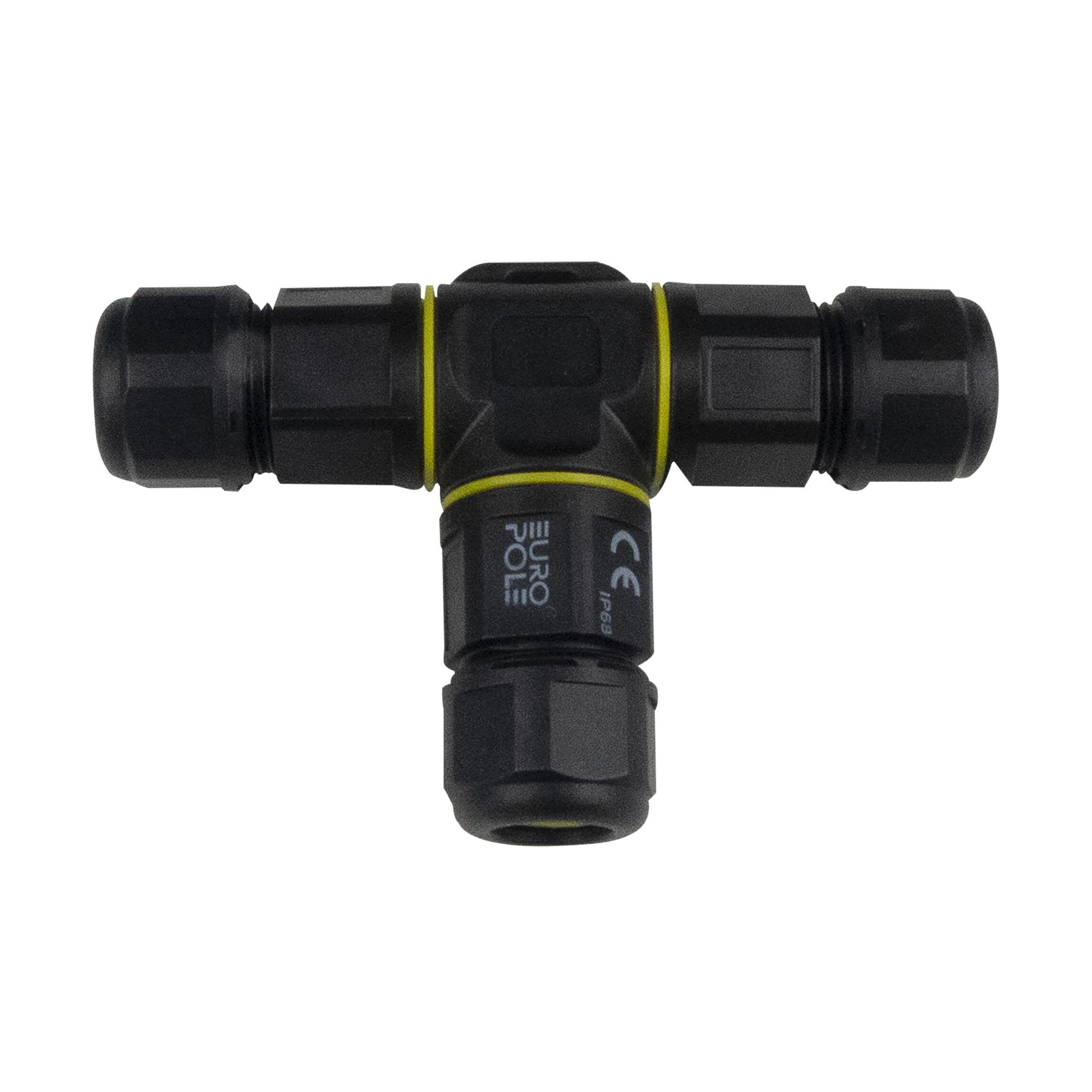 Connectique étanche IP68 EUROPOLE : connecteur en T. Bornier à vis 3 pôles intégré. Câble compatible : souple Ø minimum 5mm / Ø maximum 8,5mm. Compatible avec produits extérieurs de classe I, produits TW et câble 2213B. Section conducteur compatible : 3x1,5mm². Tension d'entrée : 250V max.