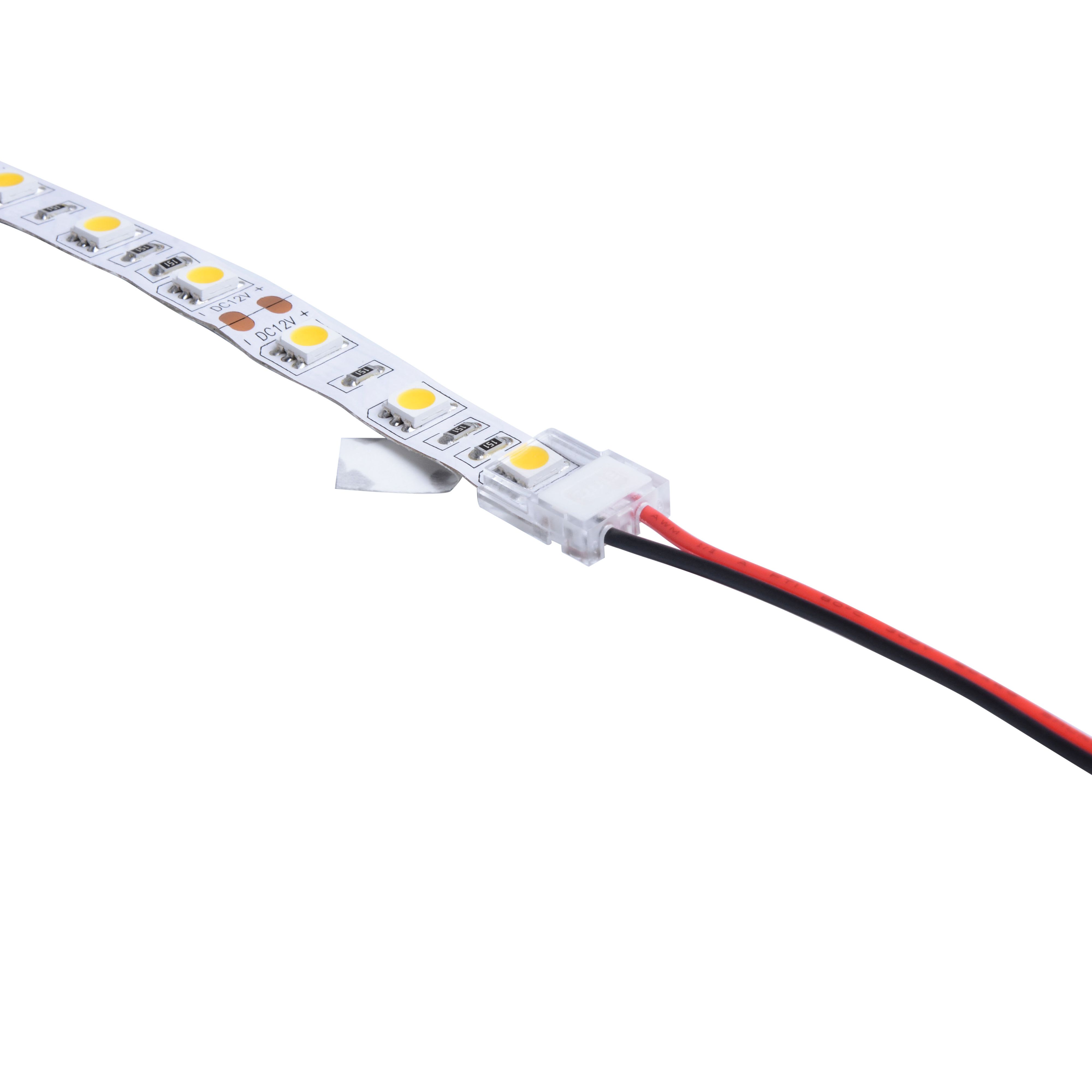 Connectique rapide 2 pôles pour linéaire 12/24V de 8mm : Bandeau - câble IP20. Conçu spécialement pour une connexion sans soudure, fixation par simple clip. Installation dans un profil aluminium possible. Vendu à l'unité.