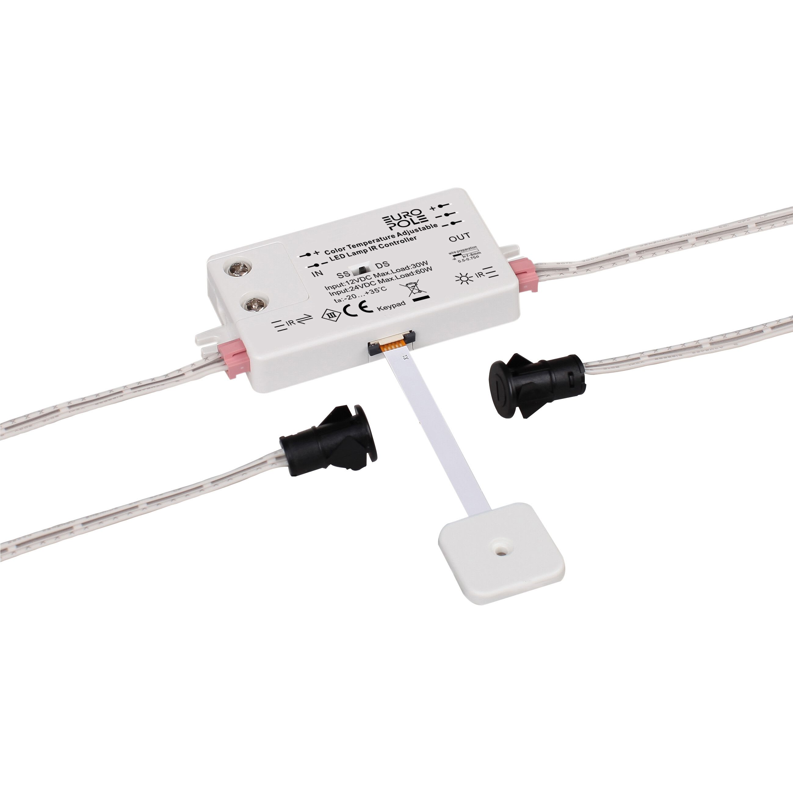 Contacteur Bi-fonction ON/OFF et variation d'intensité lumineuse pour appareils LED monochromes. DETECT DUAL EUROPOLE 30/60W IP20. Nombre de canaux : 1. Tension d'entrée : 12VDC/24VDC. Tension de sortie : 12VDC/24VDC. Courant de sortie : 2,5A. Classe de protection : III. Dimmable : Oui, variation avec capteurs intégrés. Transmission de signal : Infrarouge <5 cm et tactile . Nombre d'entrée(s) primaire(s) : 1. Nombre de sorties physiques borniers : 1. Températures de fonctionnement : -20°C/+50°C. Pour installation dans meuble.