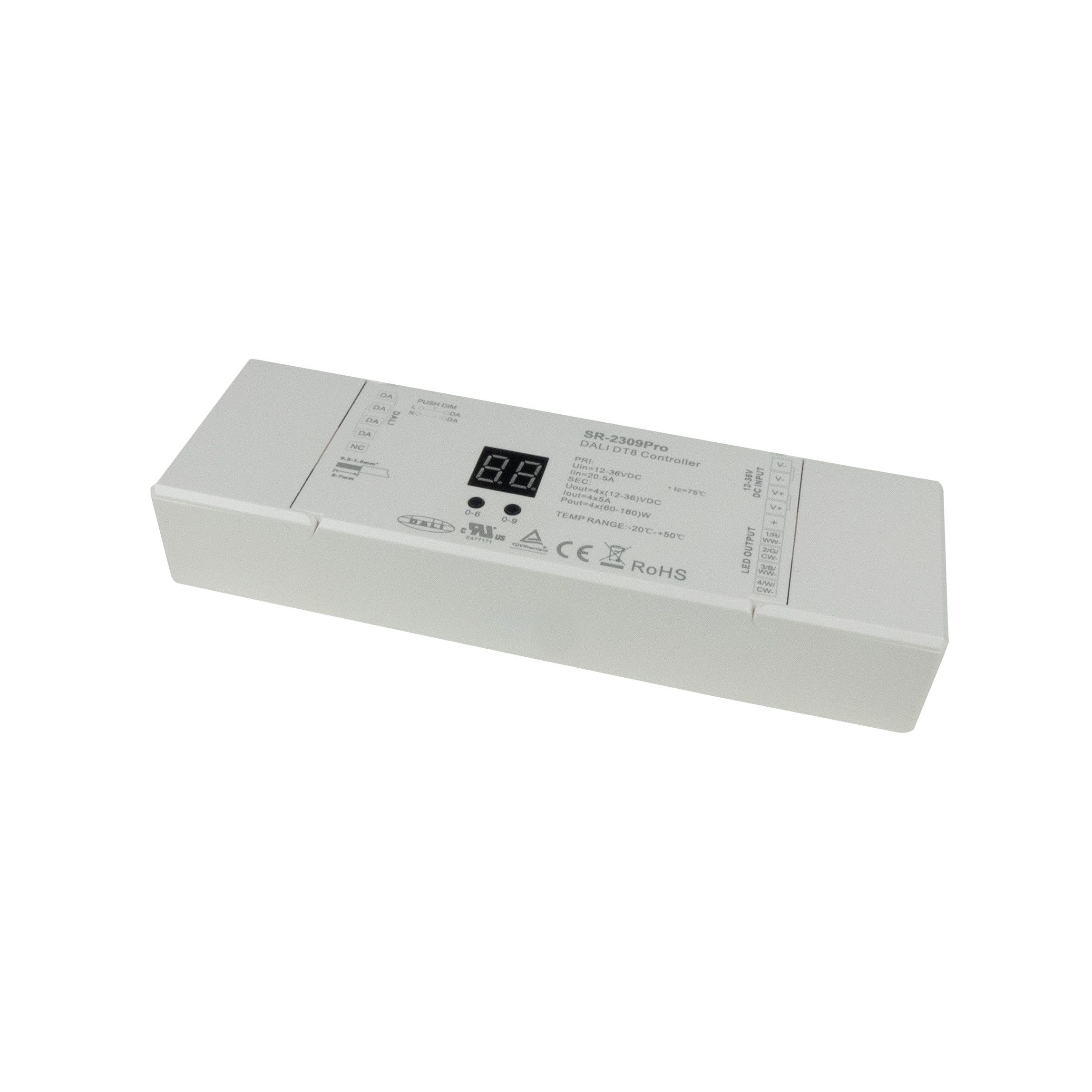 Contrôleur DALI pour produits LED monochromes, TW, RGB et RGBW : variation d'intensité lumineuse, changement de température de couleur et de couleur de la LED. DALI DT8 12/24 EUROPOLE 240/480/720W IP20. Nombre de zones indépendantes : 4. Nombre de canaux : 4. Tension d'entrée : 12VDC/24VDC/36VDC. Tension de sortie : 12VDC/24VDC/36VDC. Courant d'entrée : 20,5A. Courant de sortie : 5A. Classe de protection : II. Dimmable : Oui, variation DALI. Protocole utilisé : DALI DT8. Commande à distance : Non. Interface de communication : DALI. Transmission de signal : Filaire. Nombre d'entrée(s) primaire(s) : 2. Nombre de sorties physiques borniers : 4 (indépendantes et synchronisées selon configuration). Températures de fonctionnement : -20°C/+50°C. Adressage DALI et programmation directement sur le produit.
