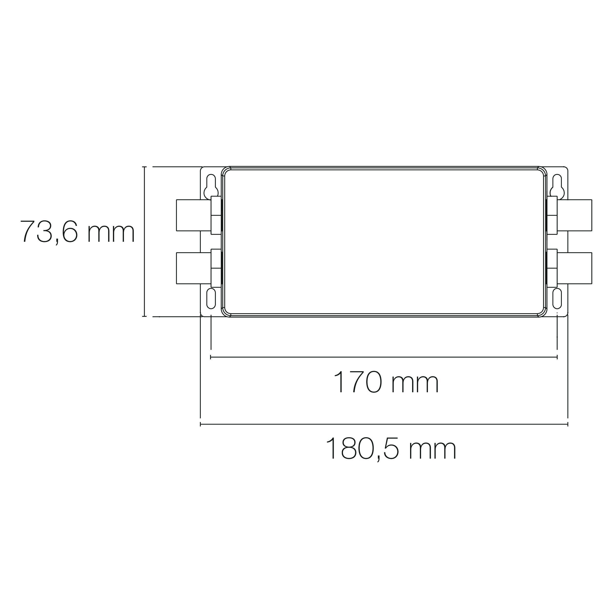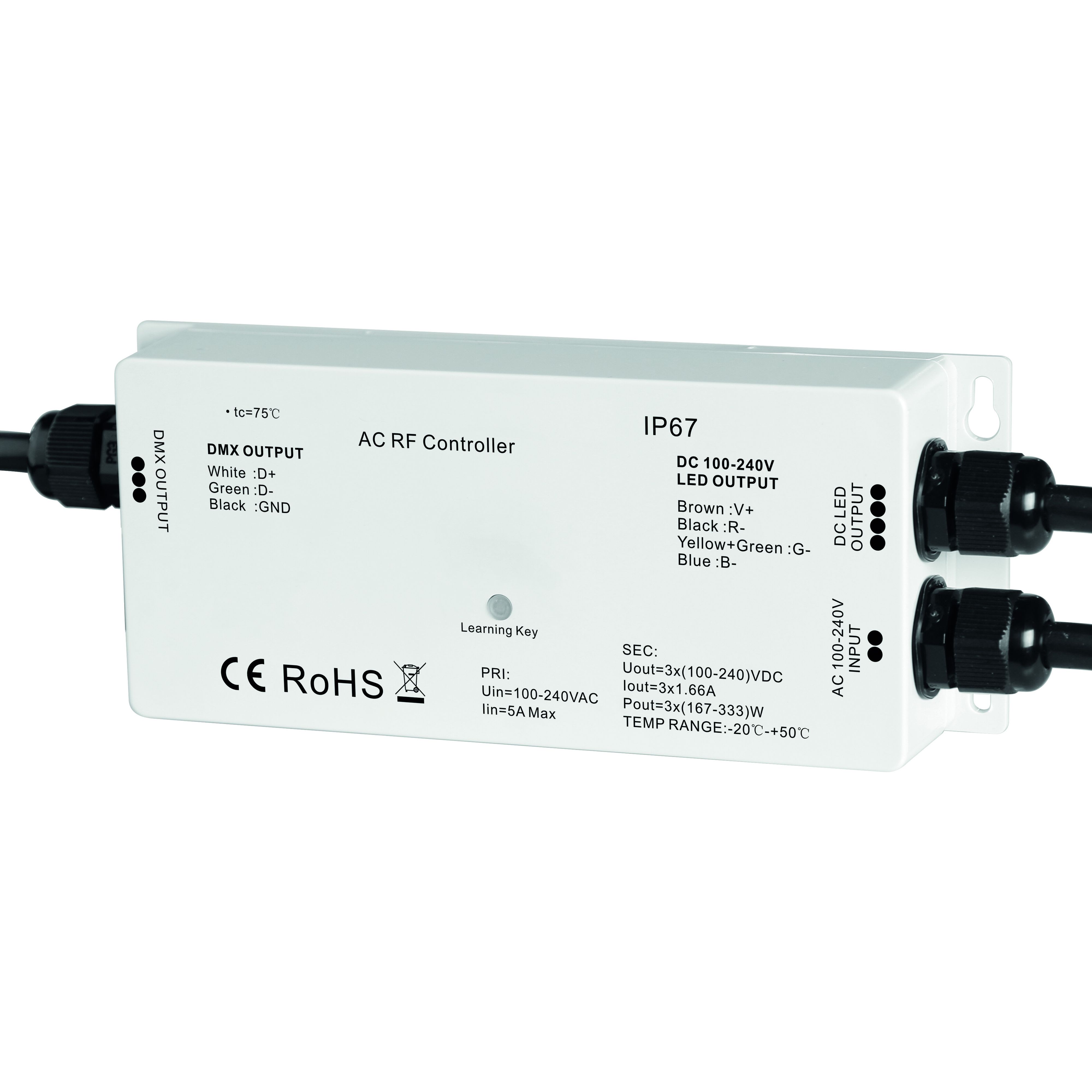 DMX 230 1200W IP67 : Contrôleur pour appareils LED monochromes et RGB 230V : variation d'intensité lumineuse et changement de couleur de LED. Entrée : 100-240VAC. Sortie : 100-240VDC. Classe II.