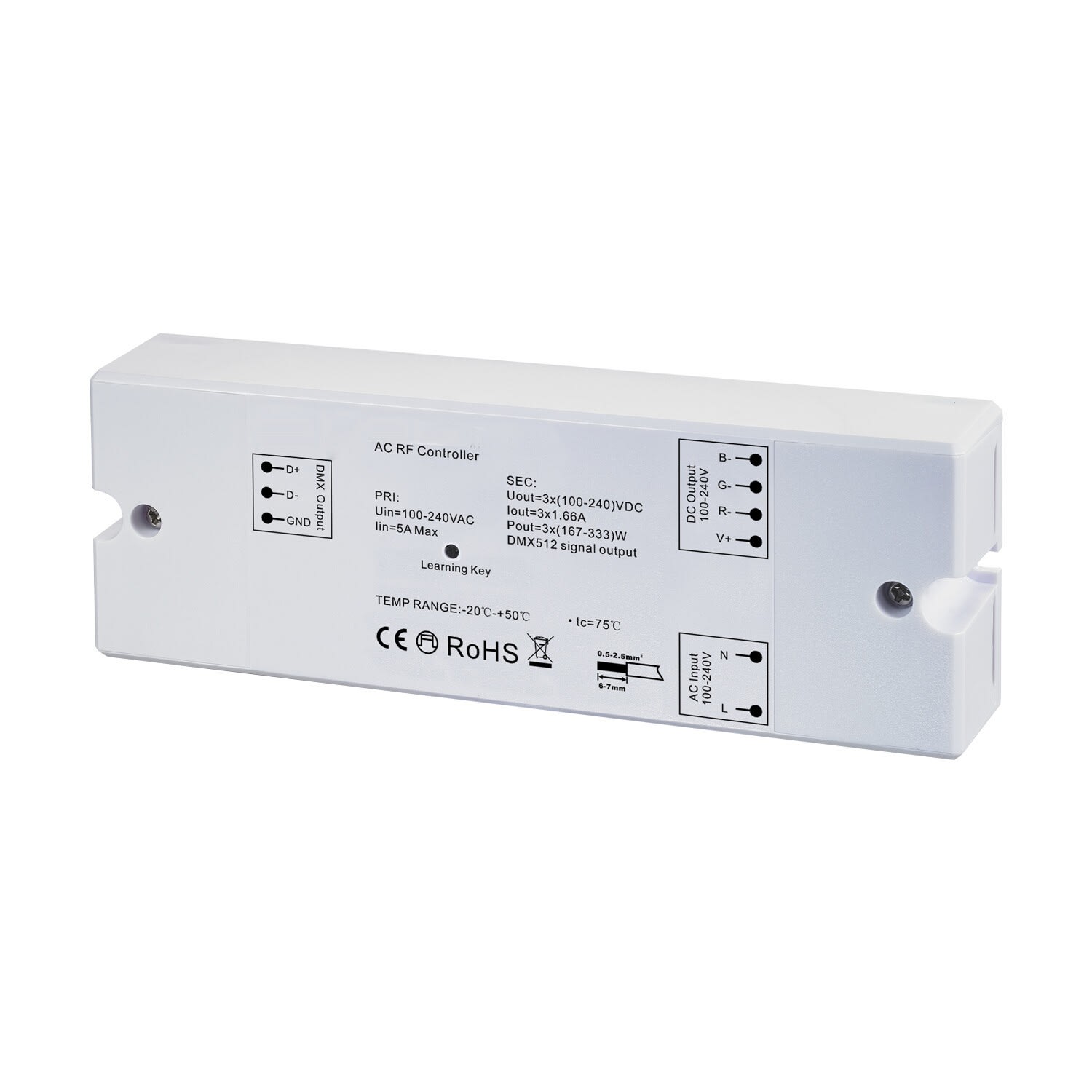 Contrôleur pour appareils LED monochromes et RGB 230V : variation d'intensité lumineuse et changement de couleur de LED. EASILED 230 EUROPOLE 1200W IP20. Nombre de canaux : 3. Tension d'entrée : 100-240VAC. Tension de sortie : 100-240VDC. Courant d'entrée : 5A. Courant de sortie : 5A. Classe de protection : II. Dimmable : Oui, variation RF. Protocole utilisé : DMX/EASILED RF. Commande à distance : Oui. Interface de communication : via télécommande EASILED MASTER REMOTE, Maître/Esclave par liaison filaire DMX. Transmission de signal : Radio HF. Nombre d'entrée(s) primaire(s) : 1. Nombre de sorties physiques borniers : 3 (indépendantes). Températures de fonctionnement : -20°C/+50°C.