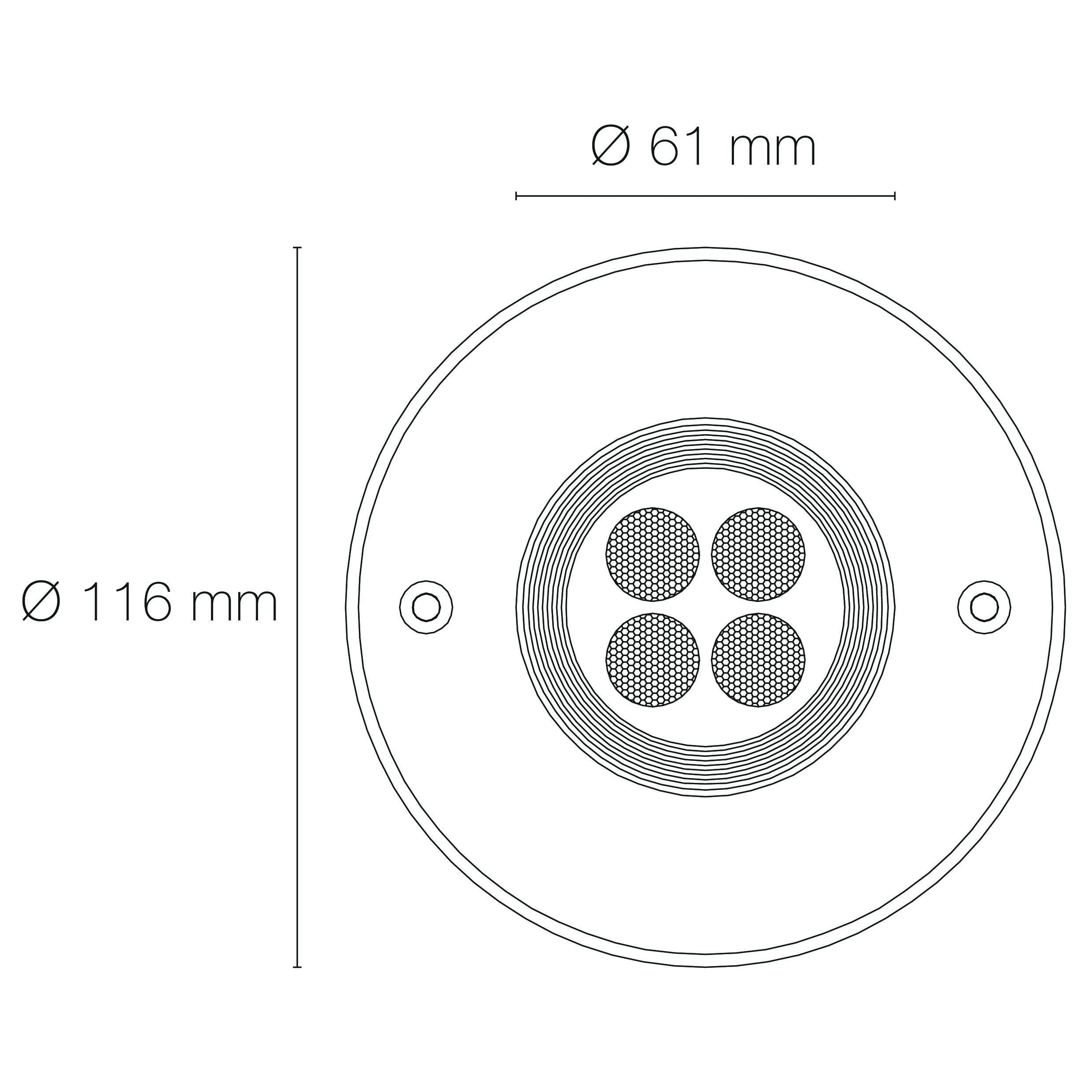 Encastré de sol EUROPOLE DEEP LIGHT 116 fixe - 230 rond inox brossé, blanc 3000K, IRC>80, 4x1,5W, 480lm (80lm/W), verre transparent/nid d'abeille basse luminance 30° (éclairage), 230VAC. Classe de protection I, IP67, IK09, câblé de 0,5m avec connectiques rapides IP68 Plug & Play mâle et femelle, HO5RN-F 3x1mm². Durée de vie : 30000h. Dimmable : Non. Dimension collerette : diamètre 116mm. Diamètre d'encastrement : 99mm. Matériau : corps en aluminium/collerette en inox 316L. Traitement de la surface : corps traité anticorrosion. Résistance environnement : garantie corrosion 15 ans. Températures de fonctionnement : -20°C/+40°C. Walkover : Oui. Driveover : 1500Kg avec pot d'encastrement. Submersible : Non. Diamètre de découpe indiqué pour installation sans pot d'encastrement.
