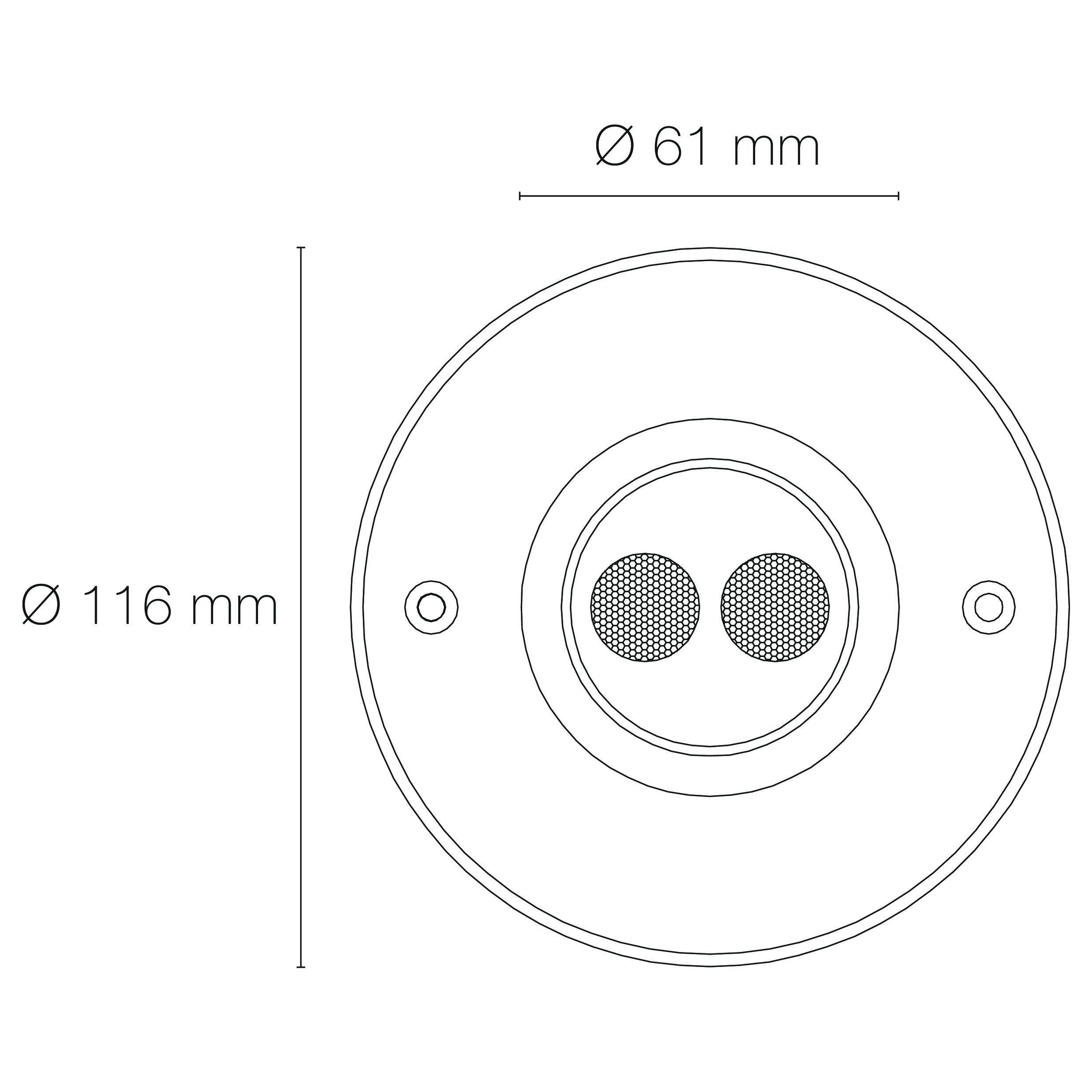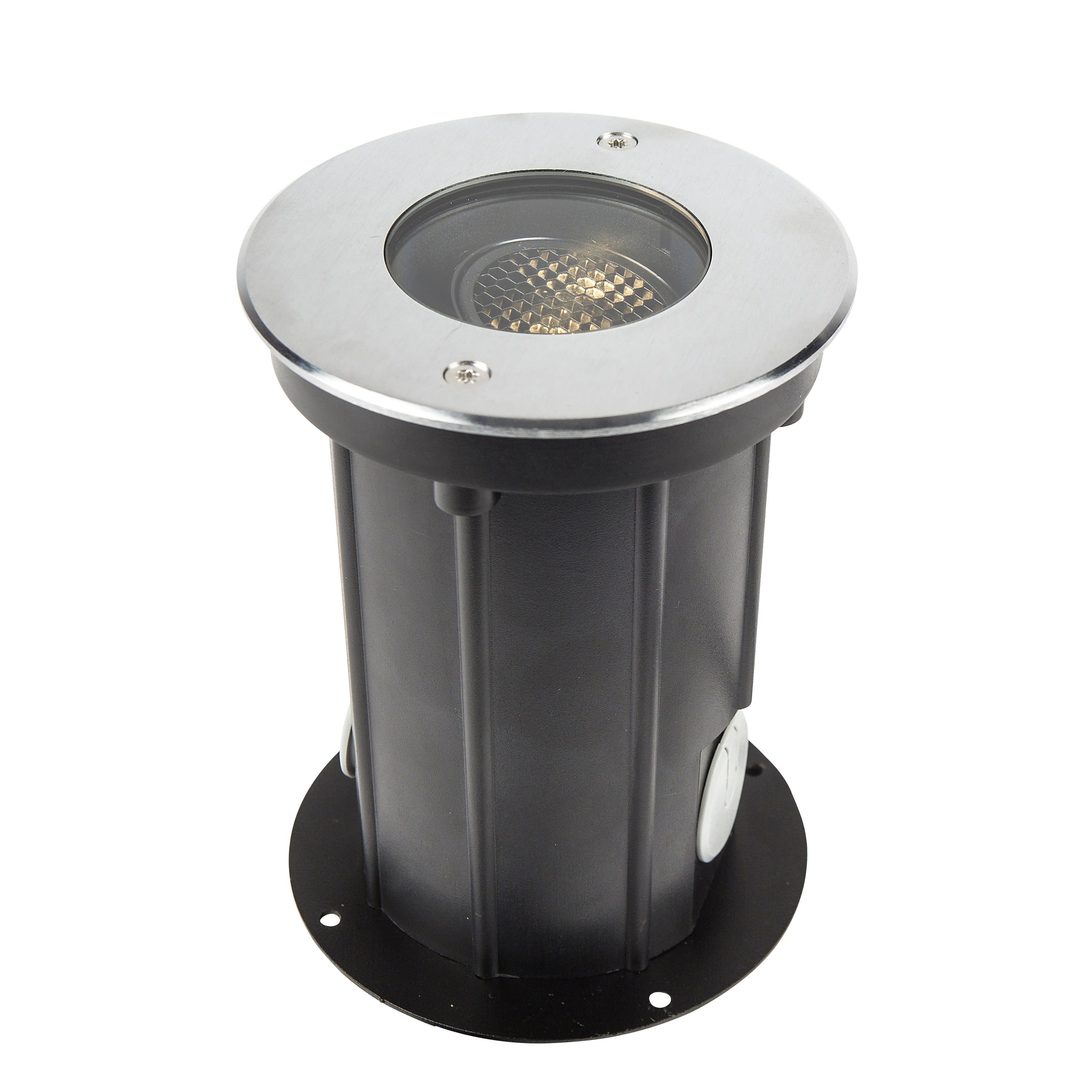 Encastré de sol EUROPOLE DEEP LIGHT 116 orientable - 24 rond inox brossé, RGBW 3W, verre transparent/nid d'abeille basse luminance 30° (éclairage), 24VDC. Optique orientable +/- 20° réglable sur le produit. Classe de protection III, IP67, IK09, câblé de 0,5m avec connectiques rapides IP68 Plug & Play mâle et femelle, HO5RN-F 5x0,5mm². Durée de vie : 30000h. Dimmable : Oui, variation avec alimentation/contrôleur compatible (non inclus). Dimension collerette : diamètre 116mm. Diamètre d'encastrement : 99mm. Matériau : corps en aluminium/collerette en inox 316L. Traitement de la surface : corps traité anticorrosion. Résistance environnement : garantie corrosion 15 ans. Températures de fonctionnement : -20°C/+40°C. Walkover : Oui. Driveover : 1500Kg avec pot d'encastrement. Submersible : Non. Diamètre de découpe indiqué pour installation sans pot d'encastrement.