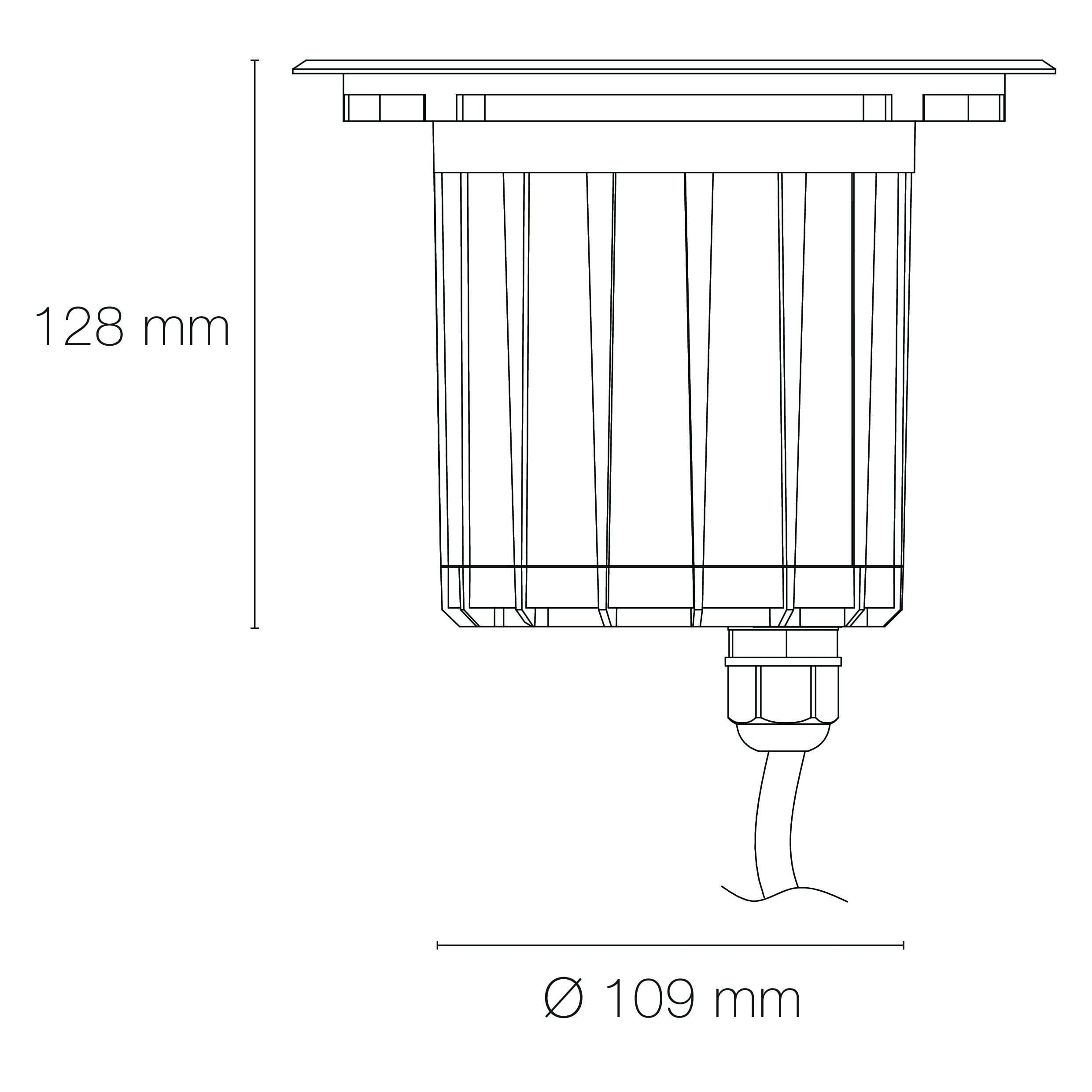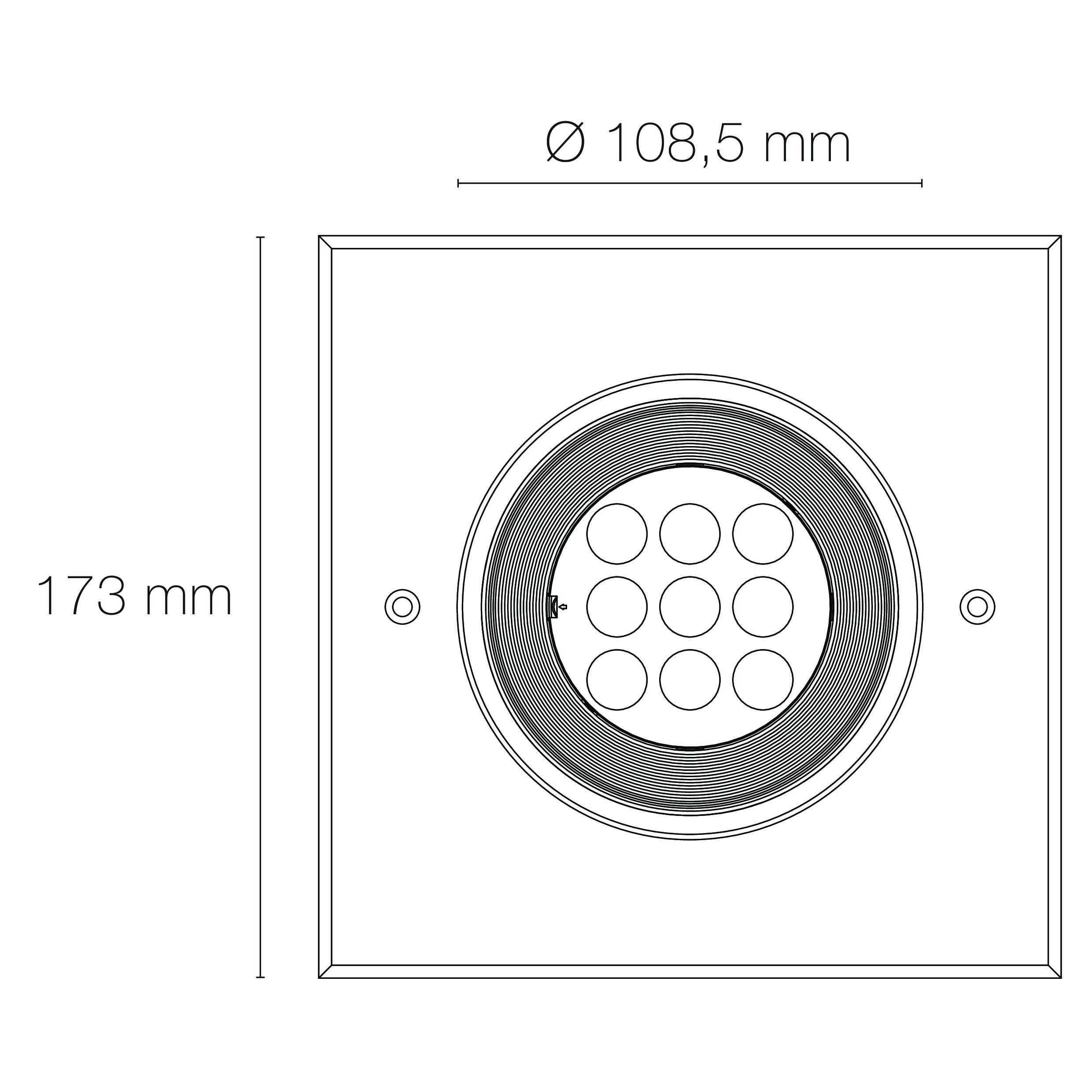 Encastré de sol EUROPOLE DEEP LIGHT 173 fixe - 230 carré inox brossé, blanc 4000K, IRC>80, 9x1,2W, 830lm (76,85lm/W), verre transparent/nid d'abeille basse luminance 30° (éclairage), 230VAC. Classe de protection I, IP67, IK10, câblé de 0,5m avec connectiques rapides IP68 Plug & Play mâle et femelle, HO5RN-F 3x1mm². Durée de vie : 30000h. Dimmable : Non. Dimension collerette : 173x173mm. Diamètre d'encastrement : 150mm. Matériau : corps en aluminium/collerette en inox 316L. Traitement de la surface : corps traité anticorrosion. Résistance environnement : garantie corrosion 15 ans. Températures de fonctionnement : -20°C/+40°C. Walkover : Oui. Driveover : 1500Kg avec pot d'encastrement. Submersible : Non. Diamètre de découpe indiqué pour installation sans pot d'encastrement.