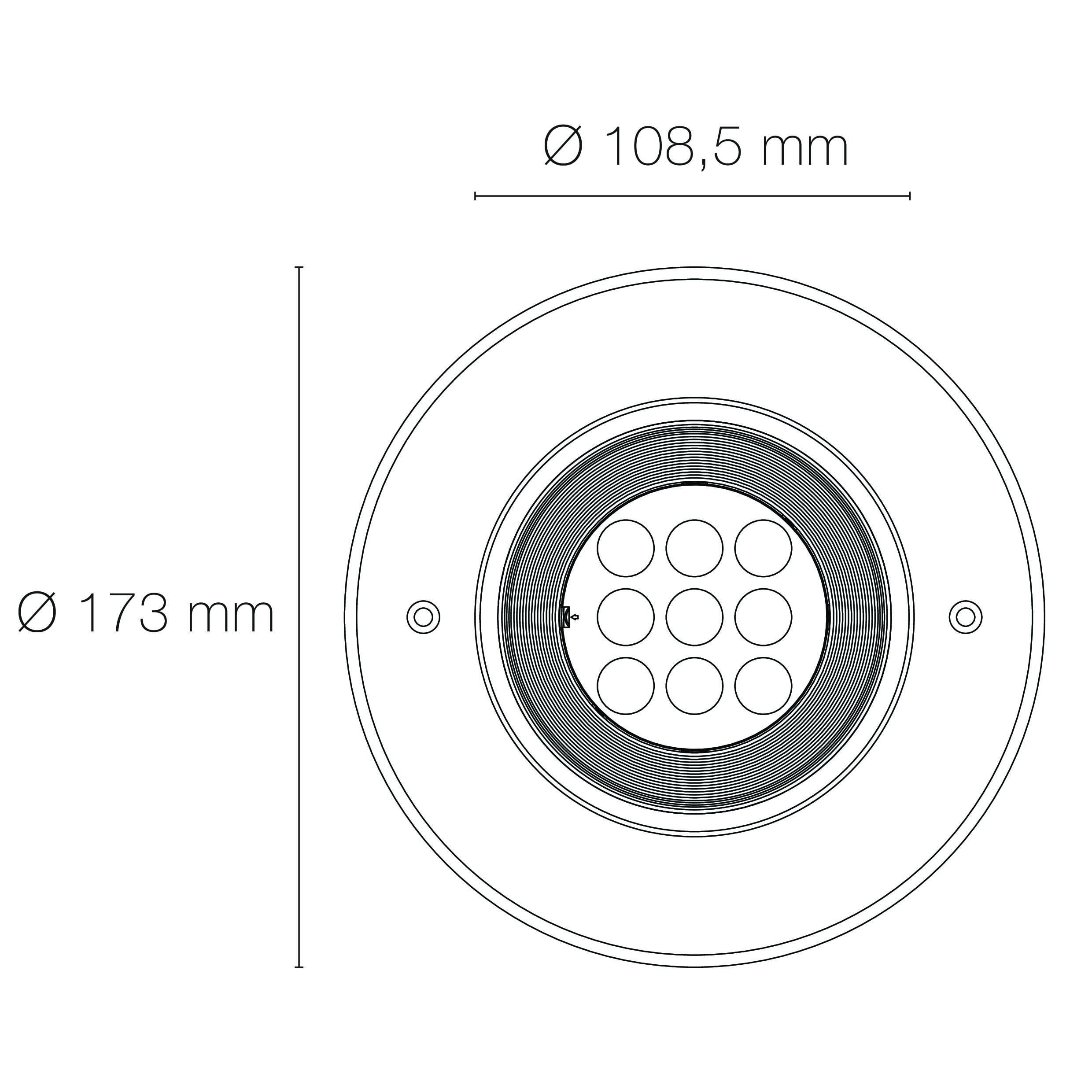 Encastré de sol EUROPOLE DEEP LIGHT 173 fixe - 230 rond inox brossé, blanc 3000K, IRC>80, 9x1,2W, 790lm (73,15lm/W), verre transparent/nid d'abeille basse luminance 30° (éclairage), 230VAC. Classe de protection I, IP67, IK10, câblé de 0,5m avec connectiques rapides IP68 Plug & Play mâle et femelle, HO5RN-F 3x1mm². Durée de vie : 30000h. Dimmable : Non. Dimension collerette : diamètre 173mm. Diamètre d'encastrement : 150mm. Matériau : corps en aluminium/collerette en inox 316L. Traitement de la surface : corps traité anticorrosion. Résistance environnement : garantie corrosion 15 ans. Températures de fonctionnement : -20°C/+40°C. Walkover : Oui. Driveover : 1500Kg avec pot d'encastrement. Submersible : Non. Diamètre de découpe indiqué pour installation sans pot d'encastrement.