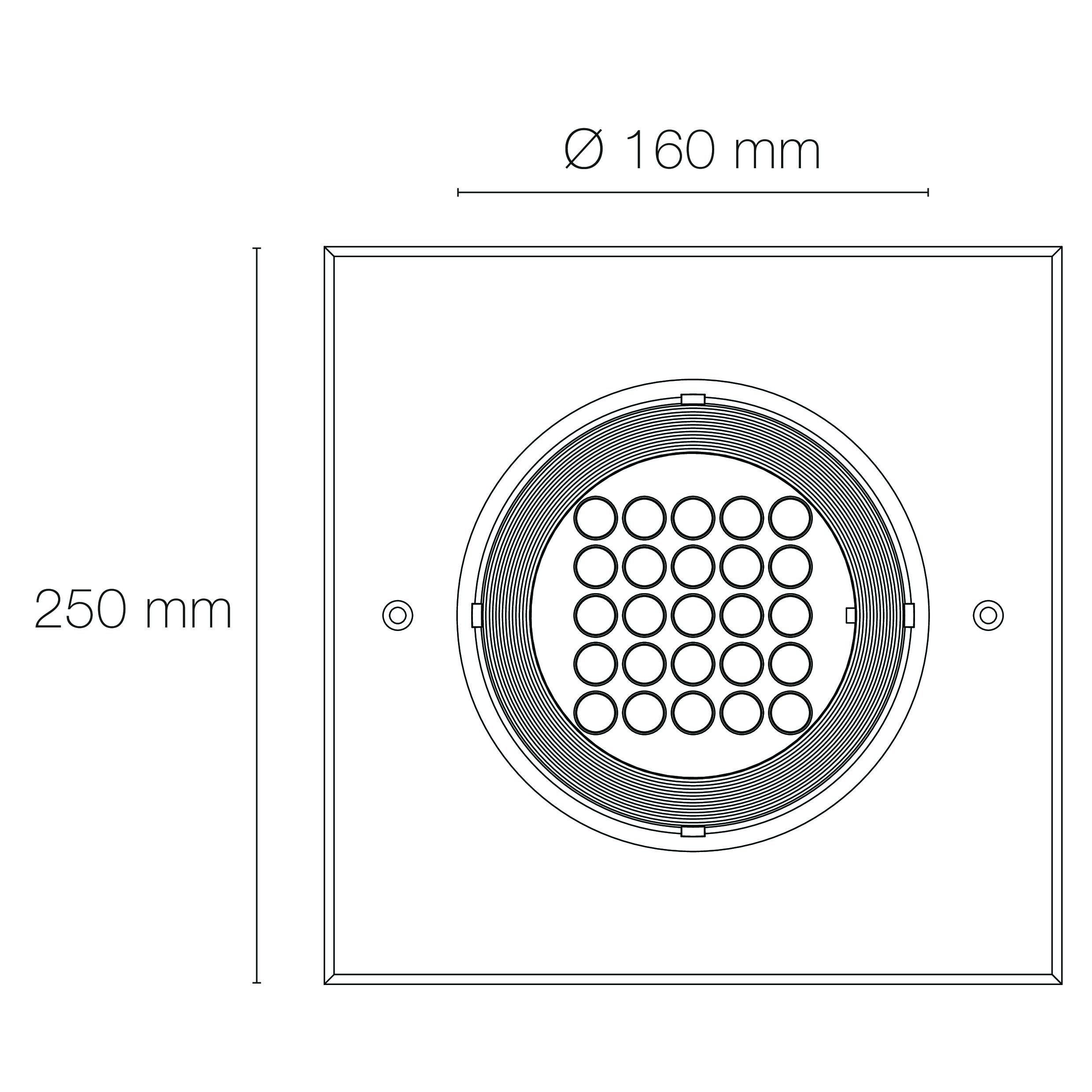 Encastré de sol EUROPOLE DEEP LIGHT 250 fixe - 230 carré inox brossé, blanc 2000K, IRC>80, 25x1W, 2205lm (88,2lm/W), verre transparent/nid d'abeille basse luminance 30° (éclairage), 230VAC. Classe de protection I, IP67, IK10, câblé de 0,5m avec connectiques rapides IP68 Plug & Play mâle et femelle, HO5RN-F 3x1mm². Durée de vie : 30000h. Dimmable : Non. Dimension collerette : 250x250mm. Diamètre d'encastrement : 219mm. Matériau : corps en aluminium/collerette en inox 316L. Traitement de la surface : corps traité anticorrosion. Résistance environnement : garantie corrosion 15 ans. Températures de fonctionnement : -20°C/+40°C. Walkover : Oui. Driveover : 1500Kg avec pot d'encastrement. Submersible : Non. Diamètre de découpe indiqué pour installation sans pot d'encastrement.