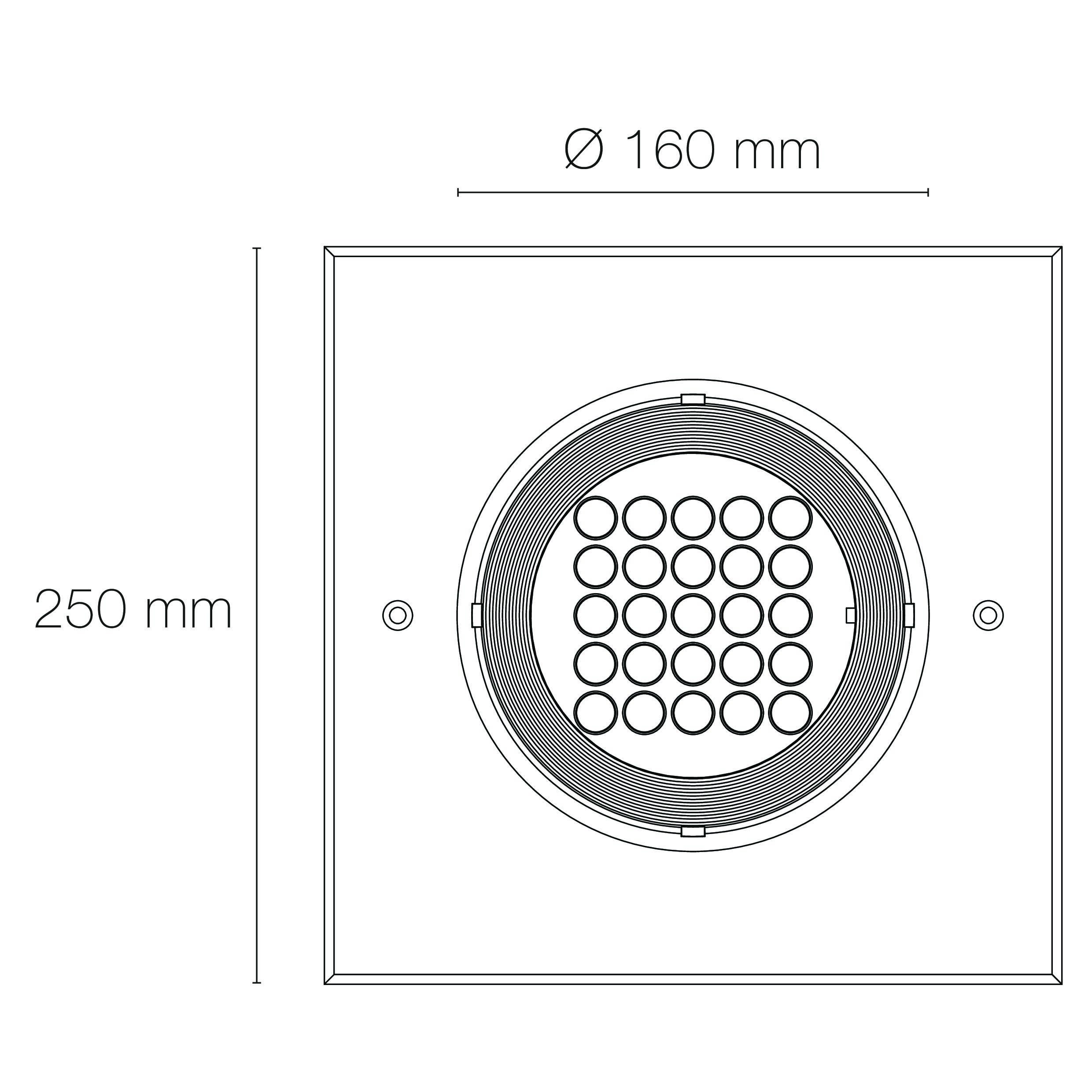 Encastré de sol EUROPOLE DEEP LIGHT 250 fixe - 230 carré inox brossé, blanc 3000K, IRC>80, 25x1W, 2329lm (93,16lm/W), verre transparent/nid d'abeille basse luminance 30° (éclairage), 230VAC. Classe de protection I, IP67, IK10, câblé de 0,5m avec connectiques rapides IP68 Plug & Play mâle et femelle, HO5RN-F 3x1mm². Durée de vie : 30000h. Dimmable : Non. Dimension collerette : 250x250mm. Diamètre d'encastrement : 219mm. Matériau : corps en aluminium/collerette en inox 316L. Traitement de la surface : corps traité anticorrosion. Résistance environnement : garantie corrosion 15 ans. Températures de fonctionnement : -20°C/+40°C. Walkover : Oui. Driveover : 1500Kg avec pot d'encastrement. Submersible : Non. Diamètre de découpe indiqué pour installation sans pot d'encastrement.