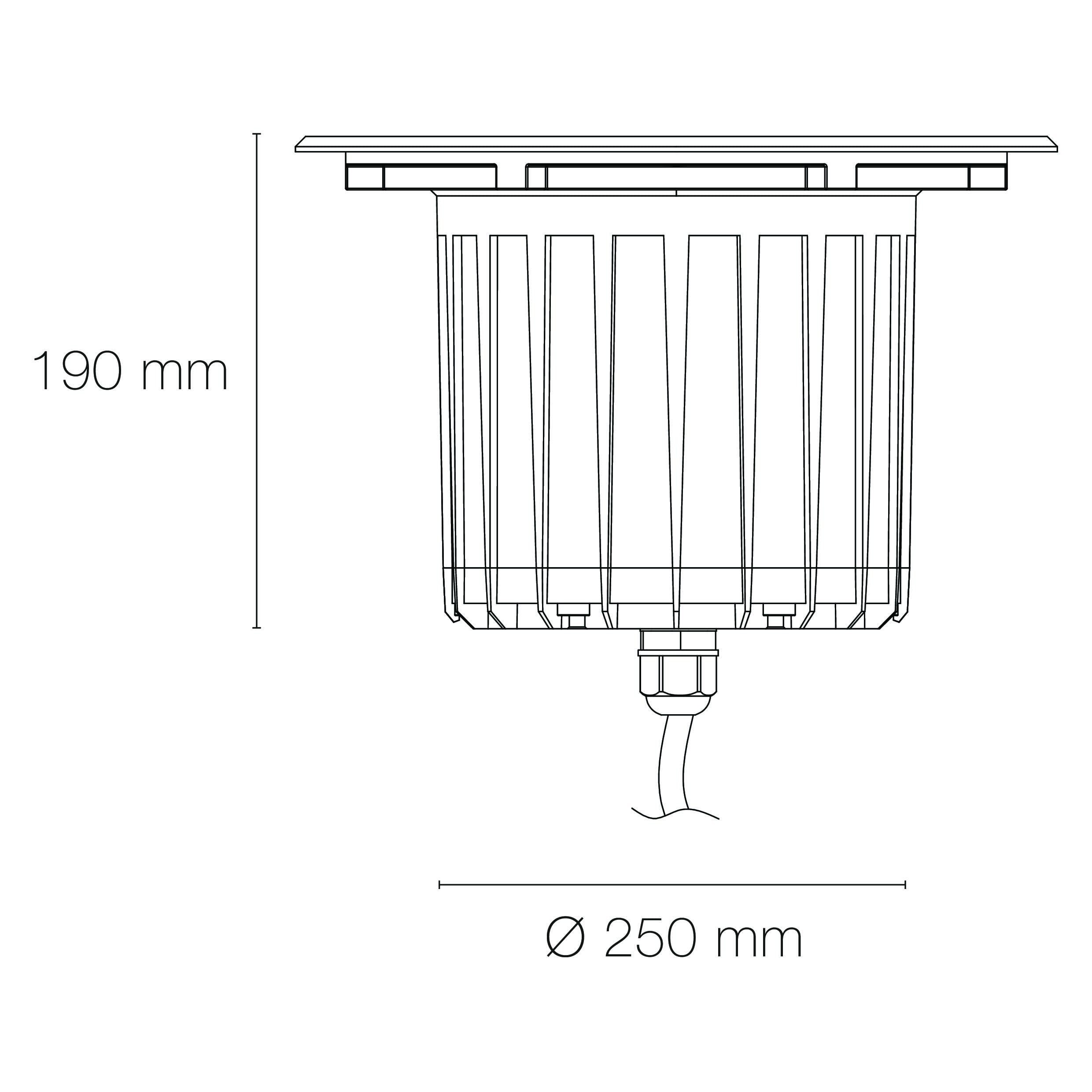 Encastré de sol EUROPOLE DEEP LIGHT 250 fixe - 230 rond inox brossé, blanc 3000K, IRC>80, 25x1W, 2329lm (93,16lm/W), verre transparent/nid d'abeille basse luminance 30° (éclairage), 230VAC. Classe de protection I, IP67, IK10, câblé de 0,5m avec connectiques rapides IP68 Plug & Play mâle et femelle, HO5RN-F 3x1mm². Durée de vie : 30000h. Dimmable : Non. Dimension collerette : diamètre 250mm. Diamètre d'encastrement : 219mm. Matériau : corps en aluminium/collerette en inox 316L. Traitement de la surface : corps traité anticorrosion. Résistance environnement : garantie corrosion 15 ans. Températures de fonctionnement : -20°C/+40°C. Walkover : Oui. Driveover : 1500Kg avec pot d'encastrement. Submersible : Non. Diamètre de découpe indiqué pour installation sans pot d'encastrement.