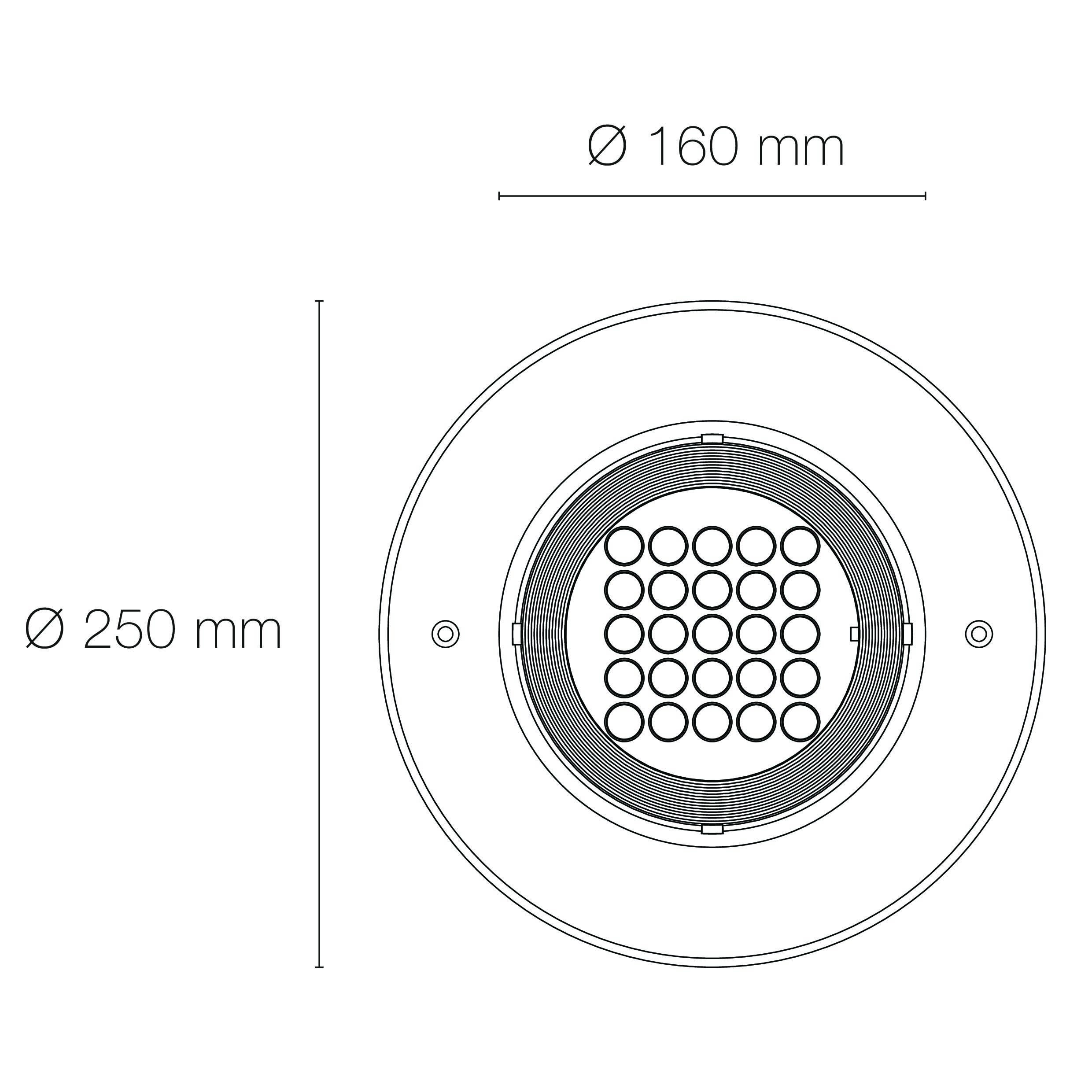 Encastré de sol DEEP LIGHT 250 fixe - 230 rond : 250mm, inox brossé, blanc 4000K, IRC>80, 25x1W, 2401lm (96,04lm/W), verre transparent/nid d'abeille basse luminance 30° (éclairage), 230VAC. Classe I, IP67. IK10. Non dimmable.