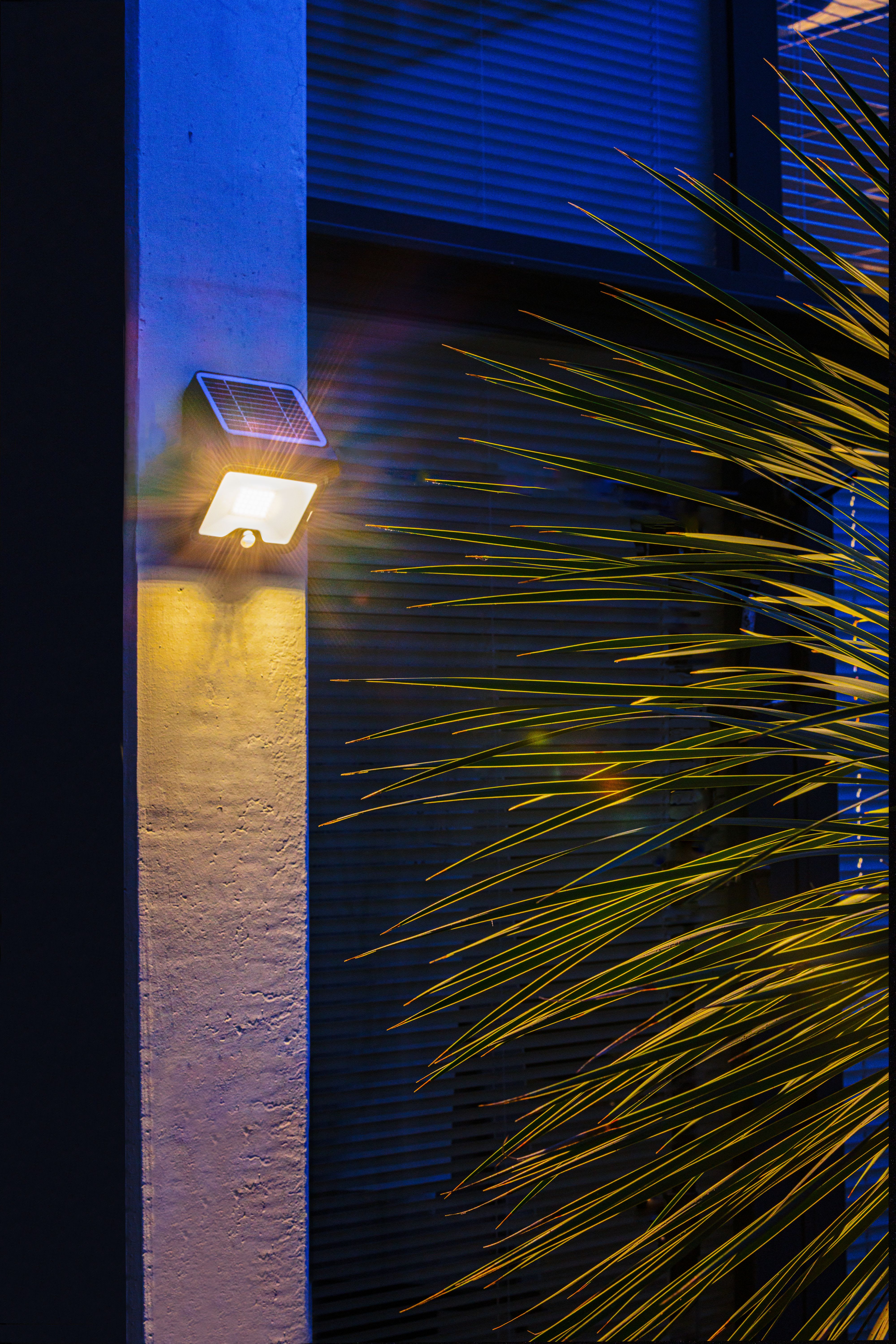 Projecteur EUROPOLE ELIOS SOLAR gris anthracite mat en applique, blanc 3000K, IRC>80, 2,5W, 300lm (120lm/W), optique translucide 120°. Type de batterie : Lithium. Batterie remplaçable. Classe de protection III, IP65, IK08. Durée de vie : 50000h. Dimmable : Non. Matériau : aluminium de fonderie. Traitement de la surface : corps traité anticorrosion. Résistance environnement : garantie corrosion 10 ans. Utilisation : extérieur. Températures de fonctionnement : 0°C/+45°C. Mode de pose/installation : en applique.Capteur de luminosité et capteur de mouvement intégrés. Zone de détection : 7m. Batterie Li-ion remplaçable. Recharge de la batterie : 6-7h.