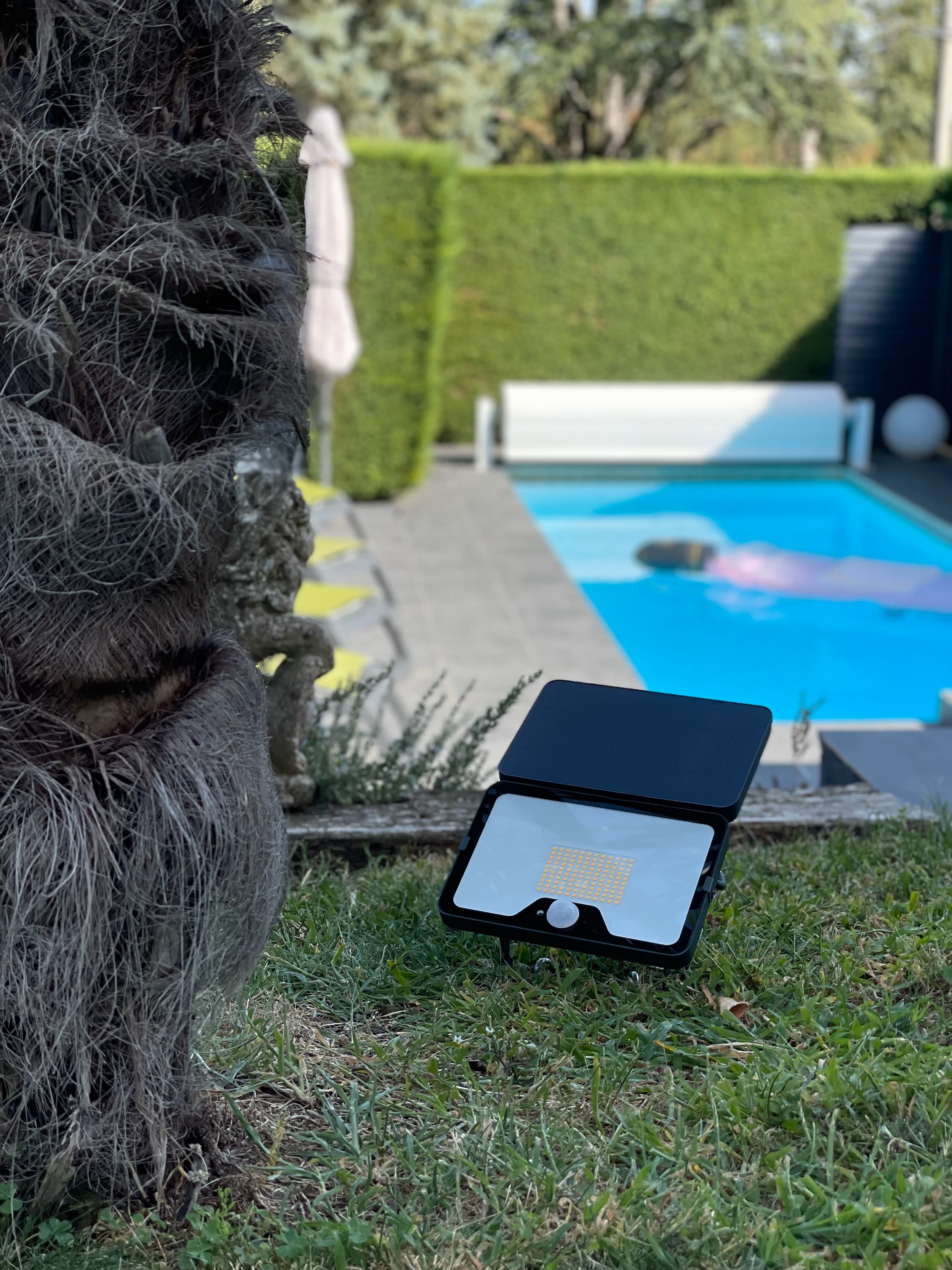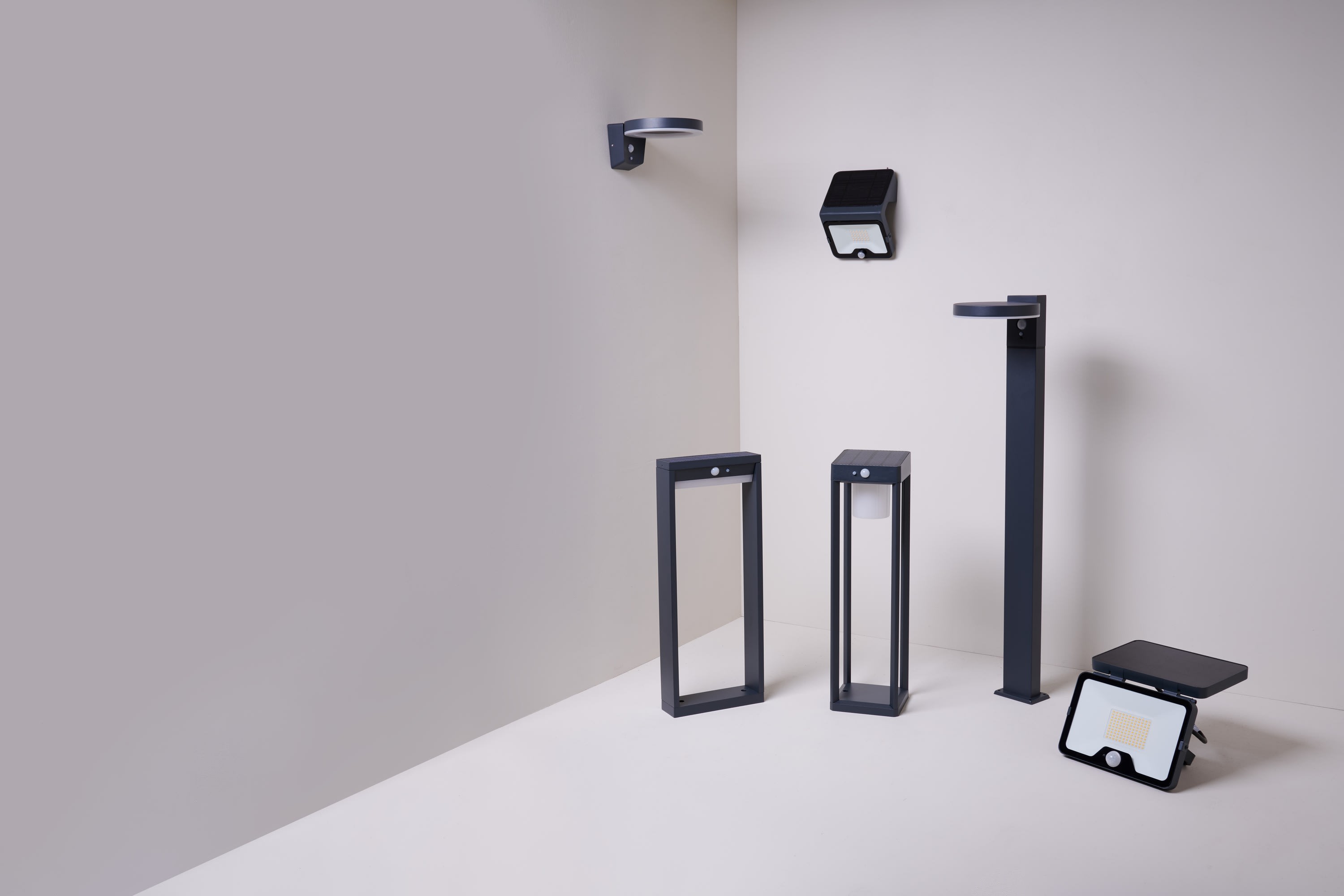 Projecteur EUROPOLE ELIOS SOLAR gris clair mat sur patère déportée, orientable, blanc 3000K, IRC>80, 8,5W, 1200lm (140lm/W), optique translucide 120°. Type de batterie : Lithium. Batterie remplaçable. Classe de protection III, IP65, IK08. Durée de vie : 50000h. Dimmable : Oui, variation avec télécommande incluse. Matériau : aluminium de fonderie. Traitement de la surface : corps traité anticorrosion. Utilisation : extérieur. Températures de fonctionnement : 0°C/+45°C. Mode de pose/installation : sur patère déportée.Capteur de luminosité et capteur de mouvement intégrés. Zone de détection : 7m. Panneau solaire pouvant être déporté. Batterie Li-ion remplaçable. Recharge de la batterie : 6-7h.