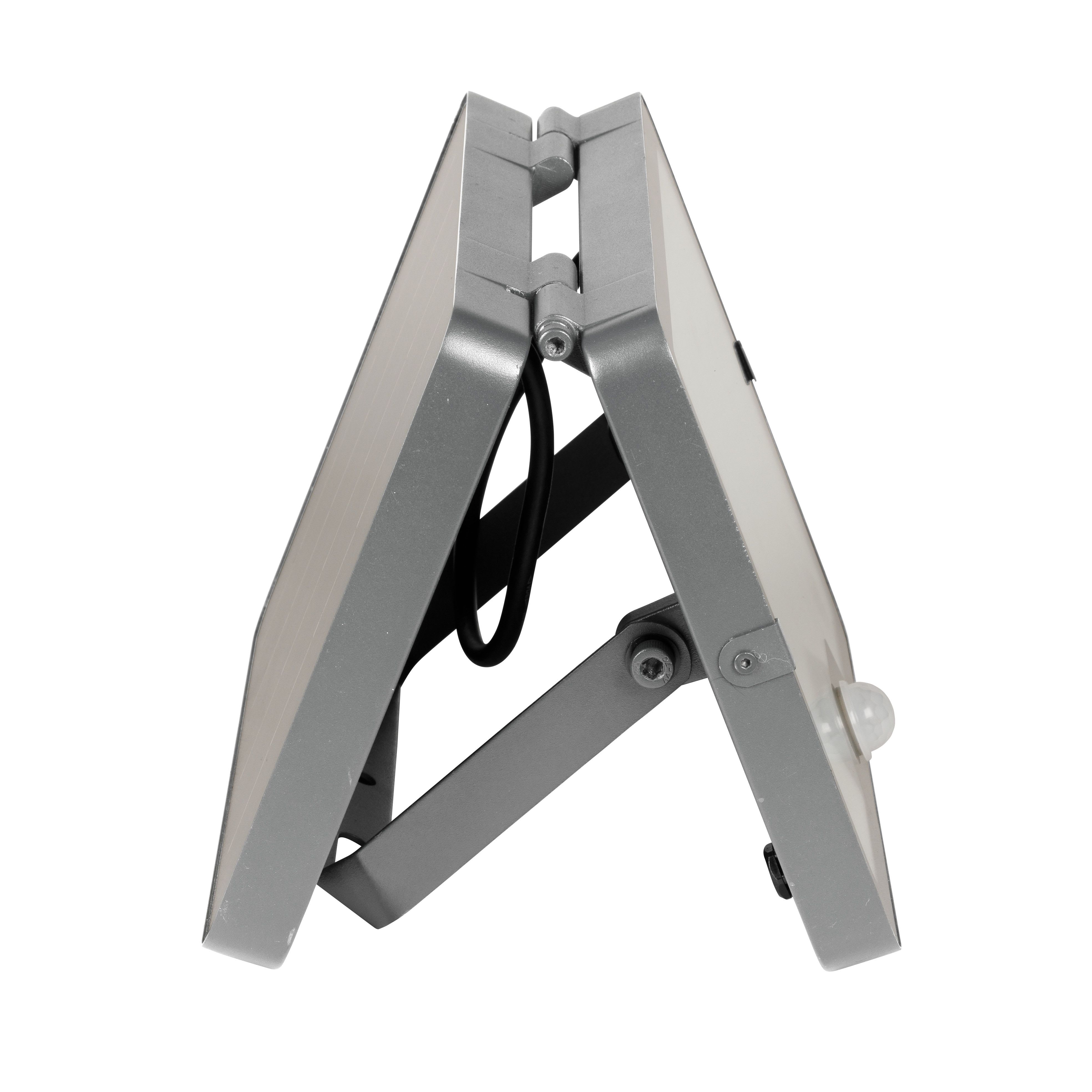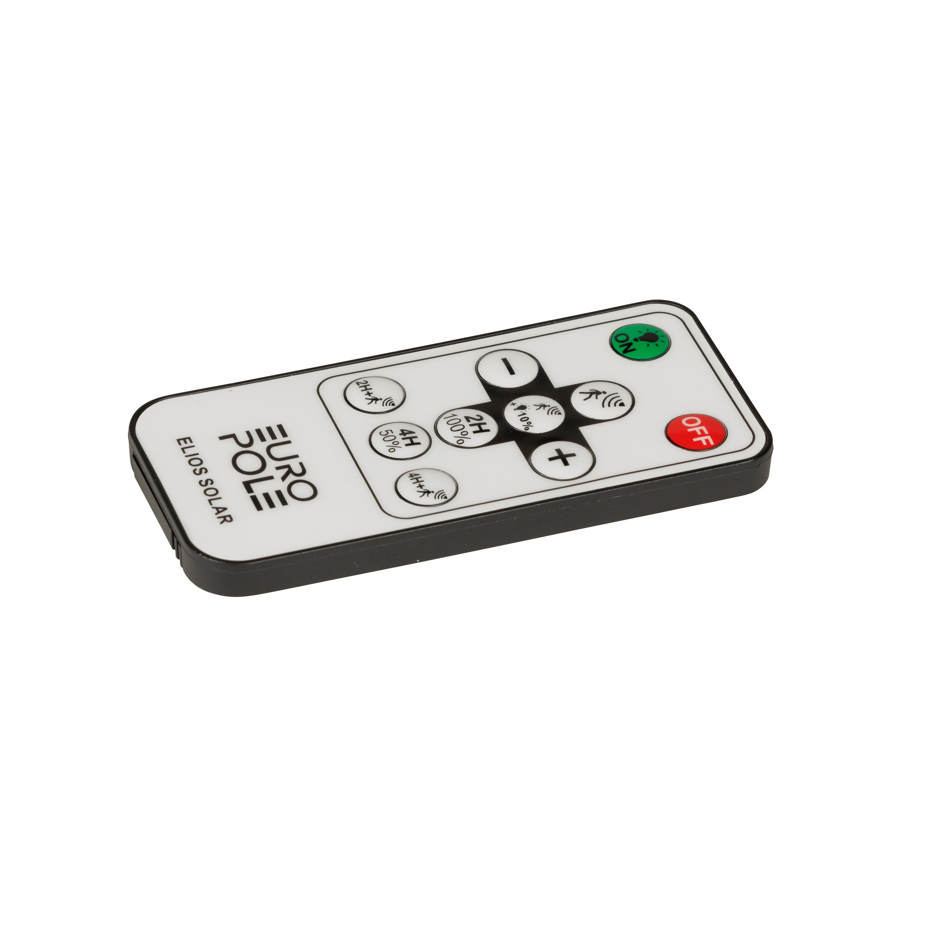 Projecteur EUROPOLE ELIOS SOLAR gris clair mat sur patère déportée, orientable, blanc 3000K, IRC>80, 15W, 2000lm (140lm/W), optique translucide 120°. Type de batterie : Lithium. Batterie remplaçable. Classe de protection III, IP65, IK08. Durée de vie : 50000h. Dimmable : Oui, variation avec télécommande incluse. Matériau : aluminium de fonderie. Traitement de la surface : corps traité anticorrosion. Utilisation : extérieur. Températures de fonctionnement : 0°C/+45°C. Mode de pose/installation : sur patère déportée.Capteur de luminosité et capteur de mouvement intégrés. Zone de détection : 7m. Panneau solaire pouvant être déporté. Batterie Li-ion remplaçable. Recharge de la batterie : 6-7h.