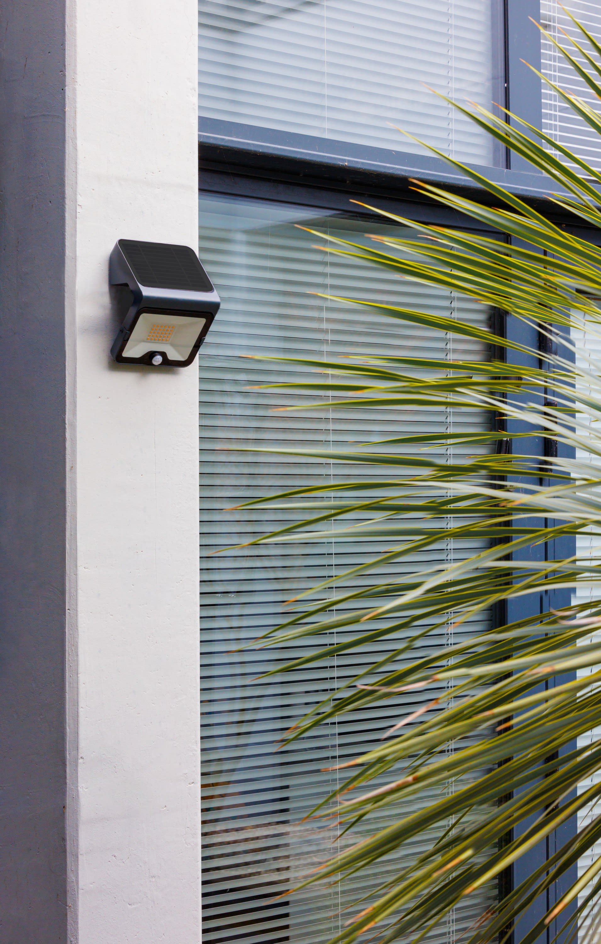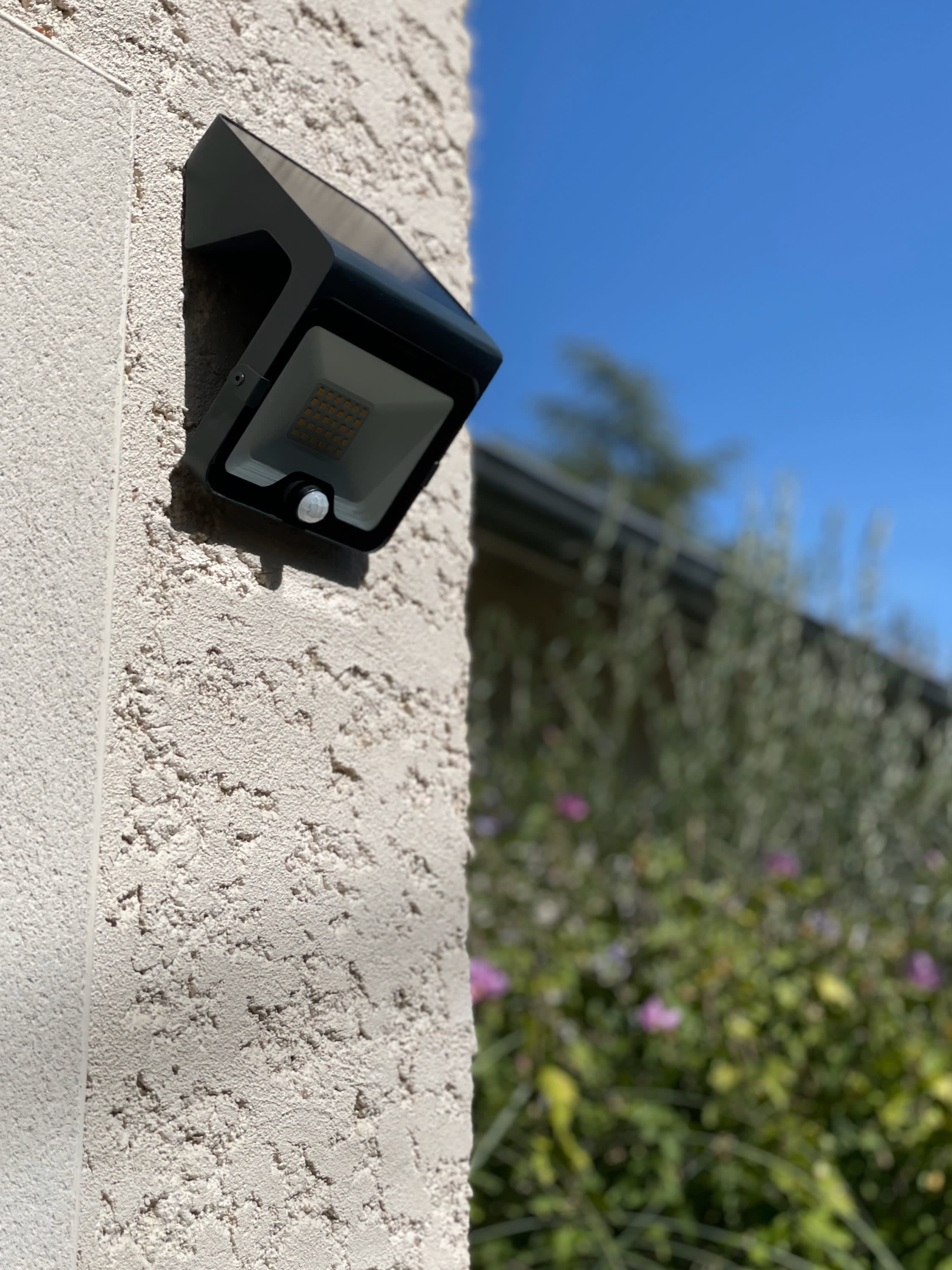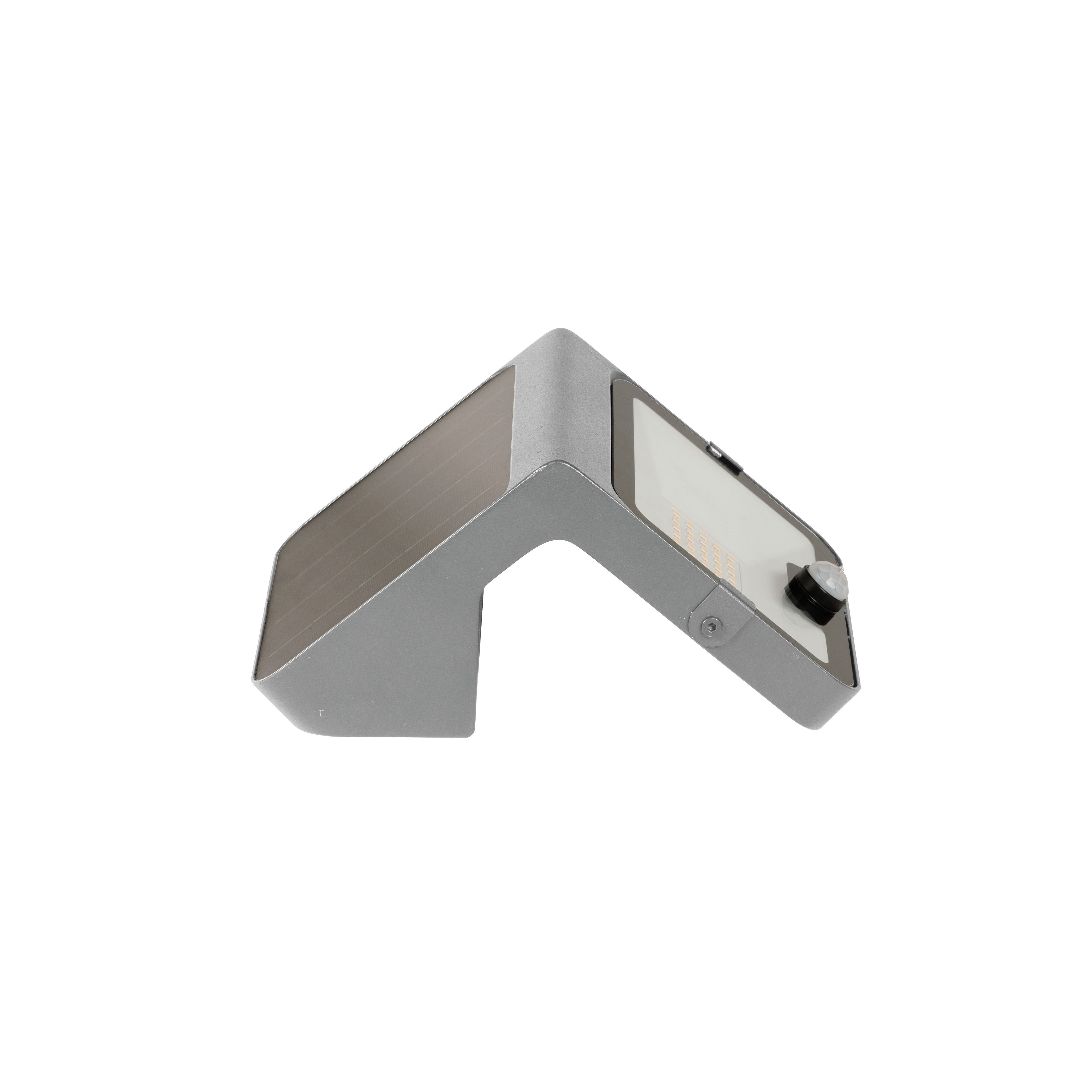 Projecteur ELIOS SOLAR gris clair mat, en applique, 3000K, IRC>80, 2,5W, 300lm (120lm/W), optique translucide 120°. Type de batterie : Lithium. Batterie remplaçable. Classe III. IP65, IK08. Non dimmable.