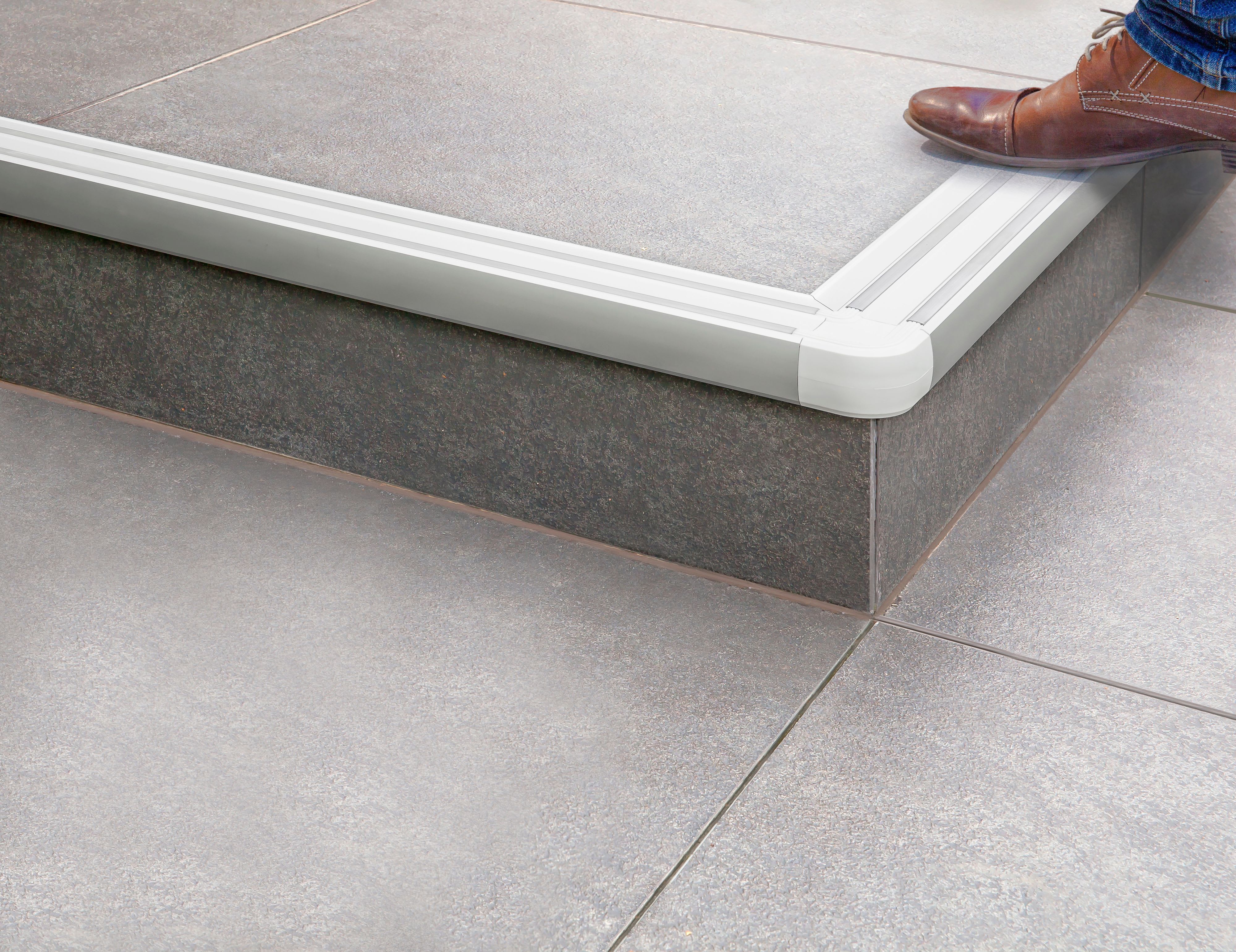 Embout d'angle avec passage de câble pour profil : STEP, gris. Finition de la surface : mat, matériau : plastique. Vendu à l'unité.