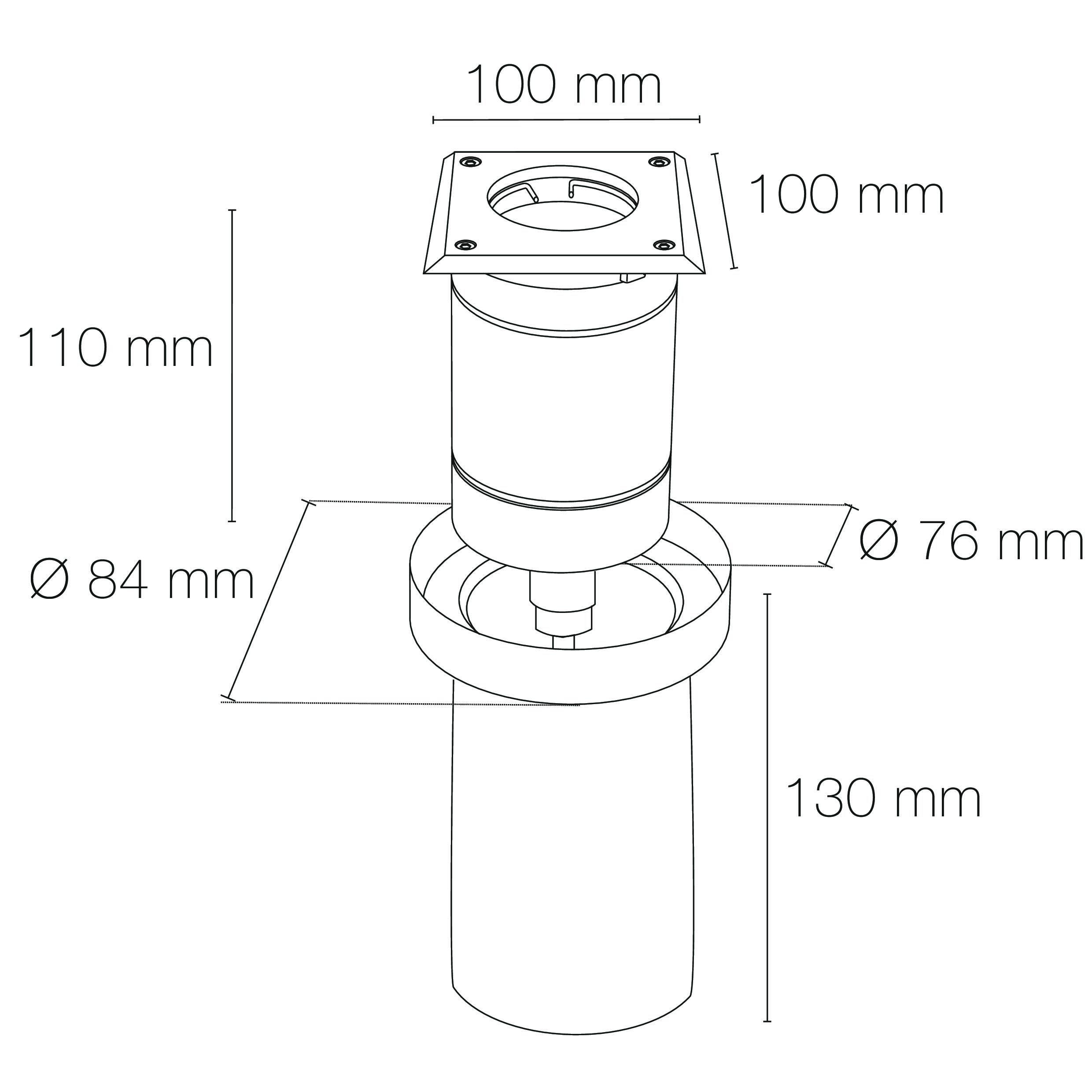 Encastré de sol EUROPOLE BOUNTY 2 carré inox, verres opale et transparent, 12VDC/230VAC. Classe de protection I, IP65, IK08, Double presse-étoupe. Dimension collerette : 100x100mm. Diamètre d'encastrement : 78mm. Matériau : collerette en inox 316L. Traitement de la surface : traitement par passivation. Températures de fonctionnement : -20°C/+40°C. Walkover : Oui. Driveover : non. Submersible : Non. Diamètre de découpe indiqué pour installation sans pot d'encastrement. Livré avec douilles GU10/GU5.3