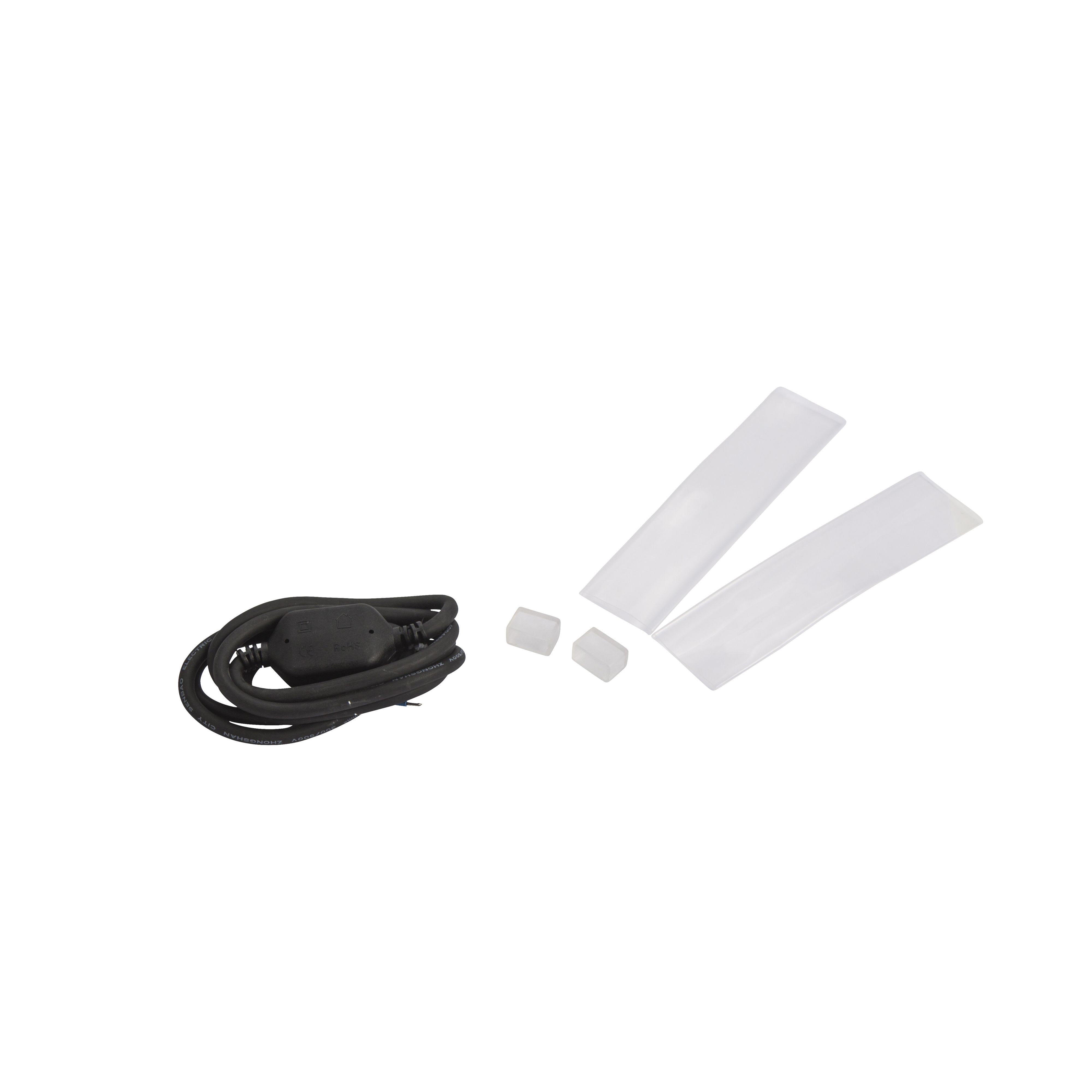 Kit de connexion pour LONG FLEX PRO Dimmable TRIAC 12W/m : 1 connecteur d'alimentation câblé 1m HO5RN-F, 2 bouchons de fin de bande, 2 gaines thermo-rétractable