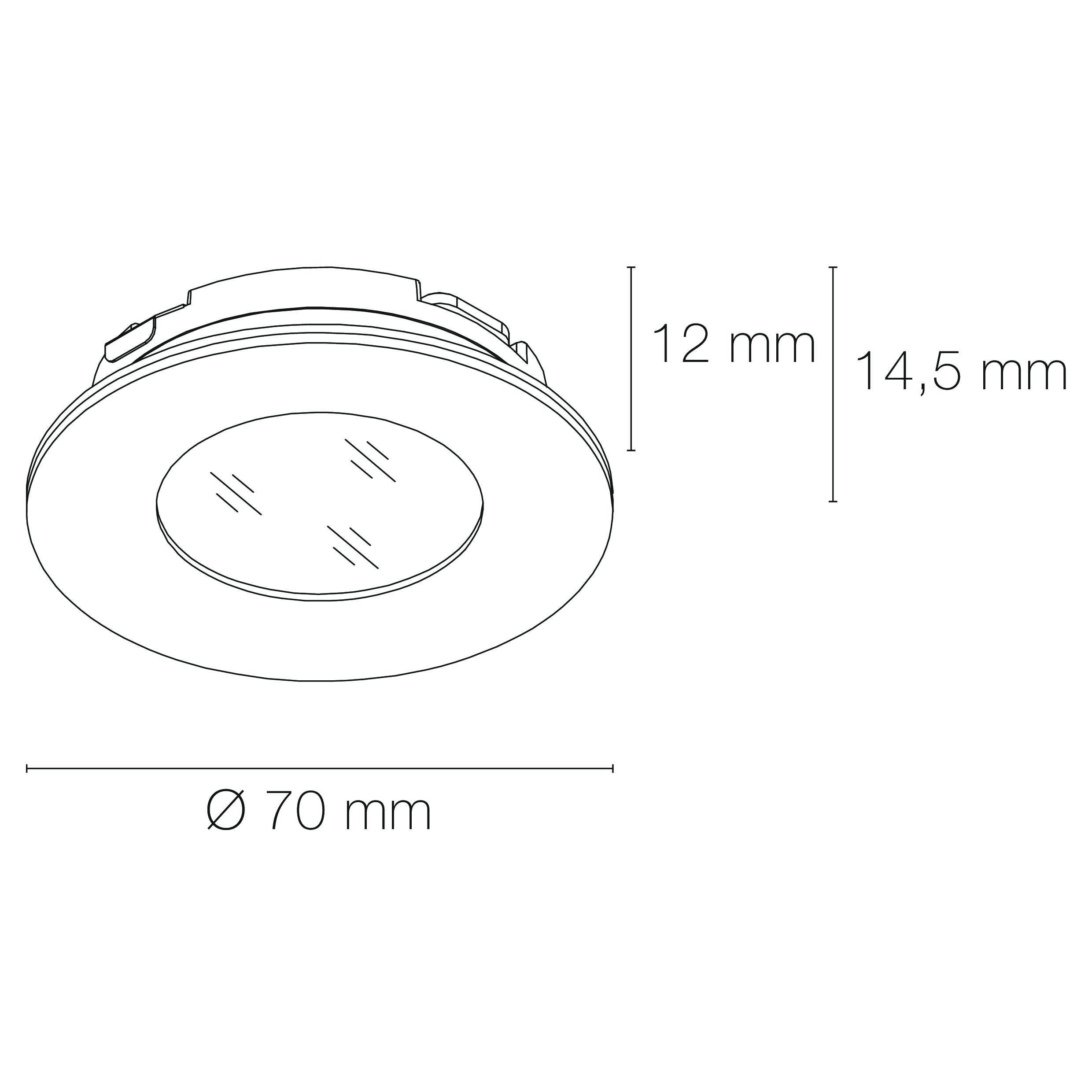 Encastré intérieur Led EUROPOLE LED'UP AGENCEMENT rond fixe, blanc mat (RAL9016), blanc 4000K, IRC>80, 3,5W, 185lm (52,86lm/W), diffuseur opale 120°, 12VDC. Classe de protection III, IP44, compatible volume salle de bain : 1, compatible isolants : non. Durée de vie : 30000h. Dimmable : Oui, variation avec alimentation/contrôleur compatible (non inclus). Raccordement rapide : Non. Dimension collerette : diamètre 70mm. Diamètre d'encastrement : 71,5mm.