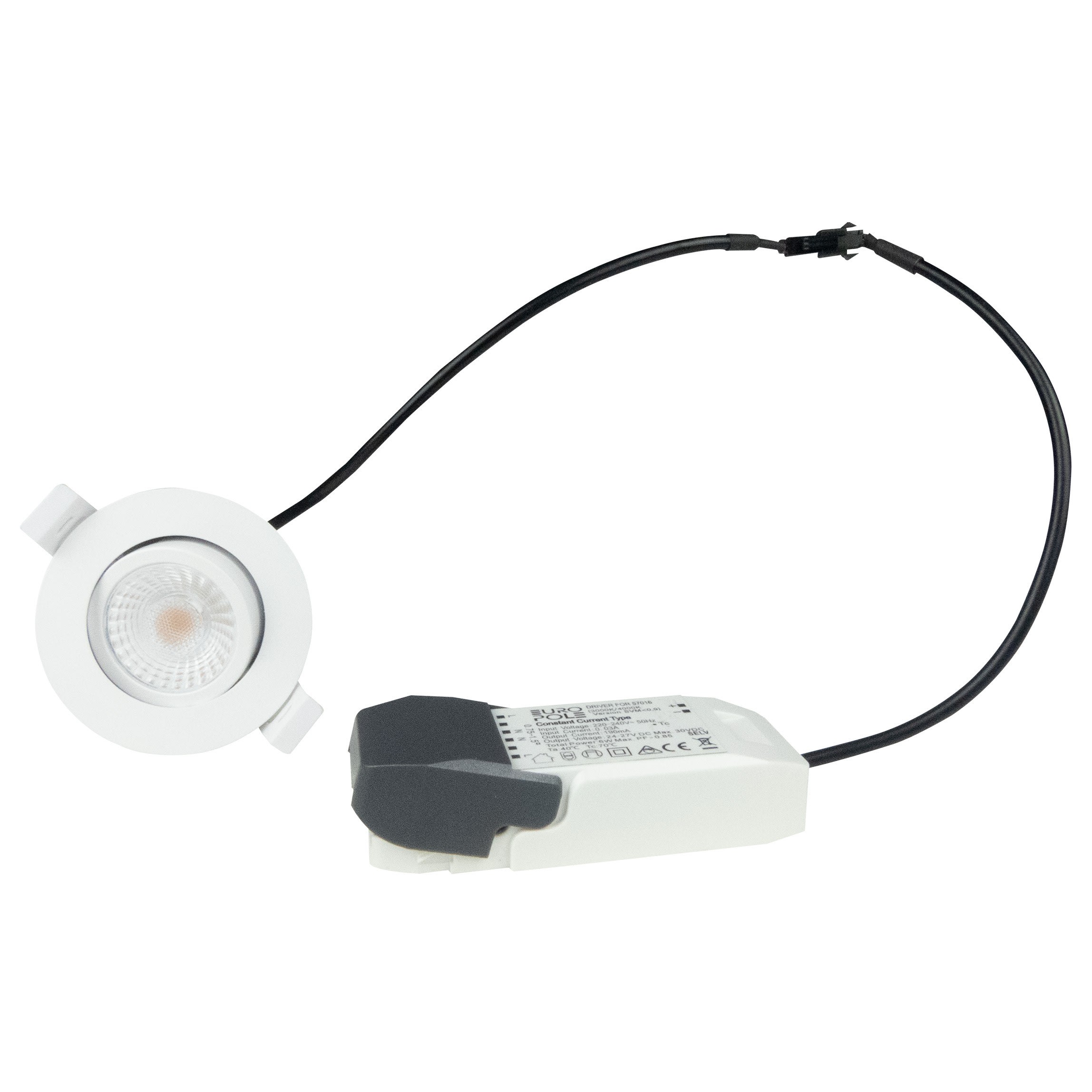 Encastré intérieur Led EUROPOLE LED'UP UNIVERSAL ONE rond orientable, blanc mat (RAL9016), blanc 4000K, IRC80, 6W, 650lm (108,3lm/W), optique dichroïque anti-éblouissement 60°, 230VAC/27VDC. Classe de protection II/III, IP65, compatible volume salle de bain : 1, RE2020, compatible isolants : soufflés et rouleaux. Durée de vie : 35000h. Dimmable : Oui, variation TRIAC. Raccordement rapide : bornier à repiquage. Dimension collerette : diamètre 82mm. Diamètre d'encastrement : 68mm. (version blanc et noir mat : garantie corrosion 10 ans). Possibilité d'installation des collerettes de finitions blanc mat et noir mat en extérieur sous abri. S'adapte à vos envies grâce à sa déclinaison d'accessoires : de nombreuses possibilités de finitions/formes de collerettes.