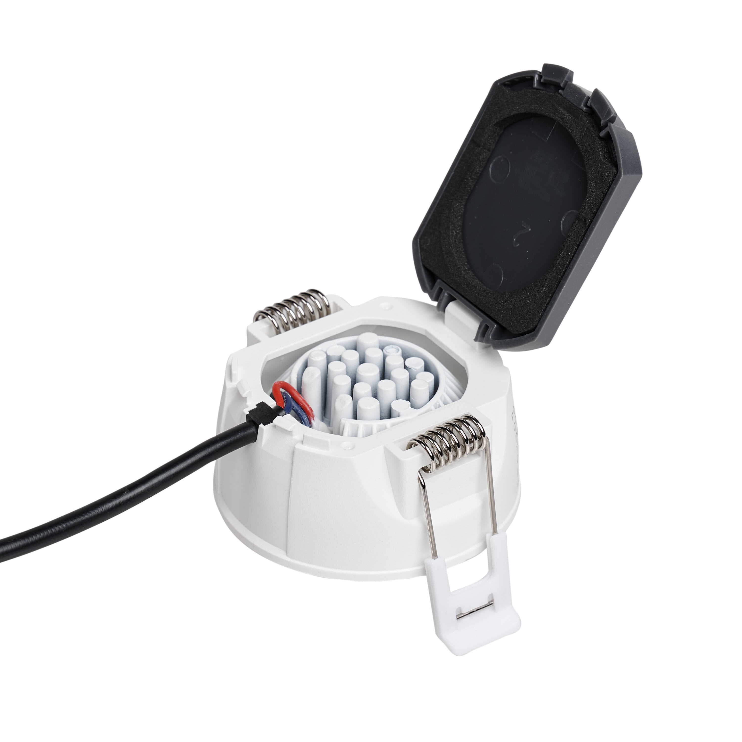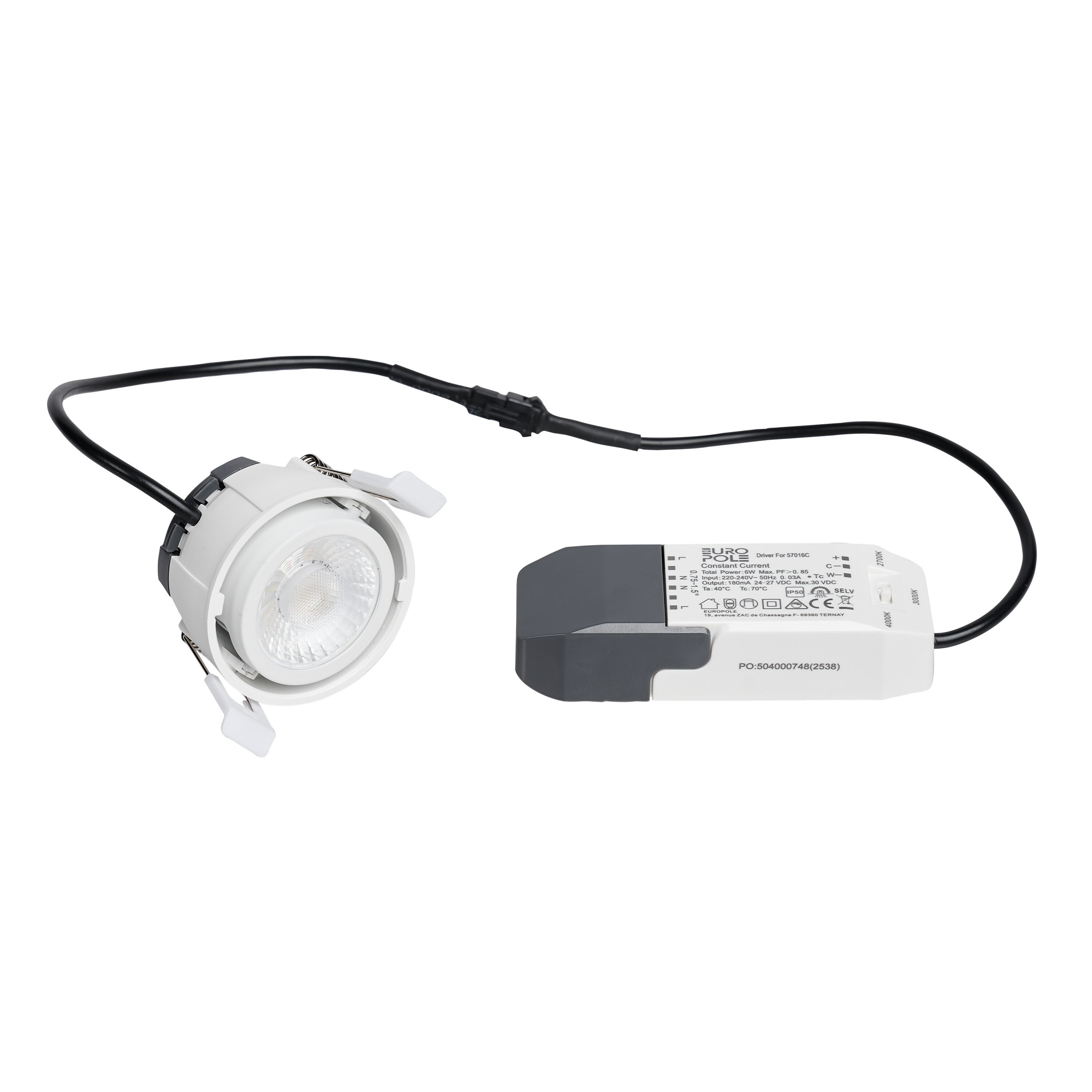 Encastré intérieur Led EUROPOLE LED'UP UNIVERSAL SWITCH II écoresponsable, orientable. Source & driver remplaçables. Polycarbonate recyclé. Vendu sans collerette. 2700K/3000K/4000K, IRC90, 6W, 500/525/600lm (88lm/W), optique dichroïque anti-éblouissement 60°, 230VAC/27VDC. Classe de protection II/III, IP65/IP50 (monté avec une collerette), compatible volume salle de bain : 1, RE2020 avec collerette, compatible isolants : tout isolant selon les normes NF EN 60598-1 et NF C 15-100-1. Durée de vie : 50000h. Dimmable : oui, variation TRIAC. Raccordement rapide : bornier à repiquage. Diamètre d'encastrement : 68mm. Collerette à commander séparément et à monter sur le produit par 1/4 de tour. Possibilité d'installation des collerettes de finitions blanc mat et noir mat en extérieur sous abri (version blanc et noir mat : garantie corrosion 10 ans). S'adapte à vos envies grâce à sa déclinaison d'accessoires de la gamme LED'UP UNIVERSAL : de nombreuses possibilités de finitions/formes de collerettes.