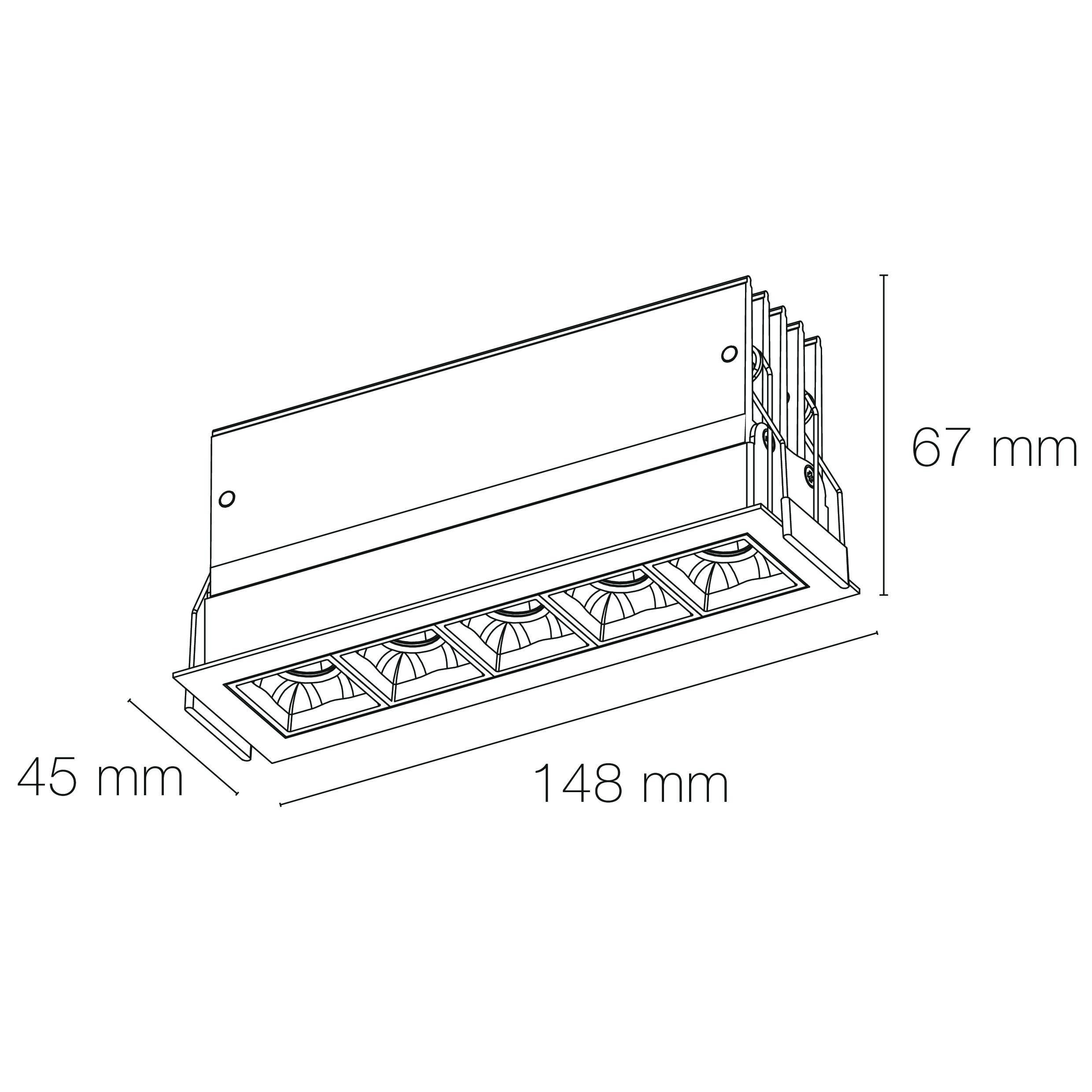 Encastré intérieur Led EUROPOLE NELIO 5 rectangle fixe, noir mat (RAL9005), blanc 4000K, IRC>90, 24,7W, 2367lm (96 lm/W), optique faible éblouissement 44°, 230VAC/37VDC. Classe de protection II/III, IP20, compatible volume salle de bain : non, RE2020, compatible isolants : non. Durée de vie : 40000h. Dimmable : non. Raccordement rapide : bornier à repiquage. Dimension collerette : 148x45mm. Alimentation déportée incluse.