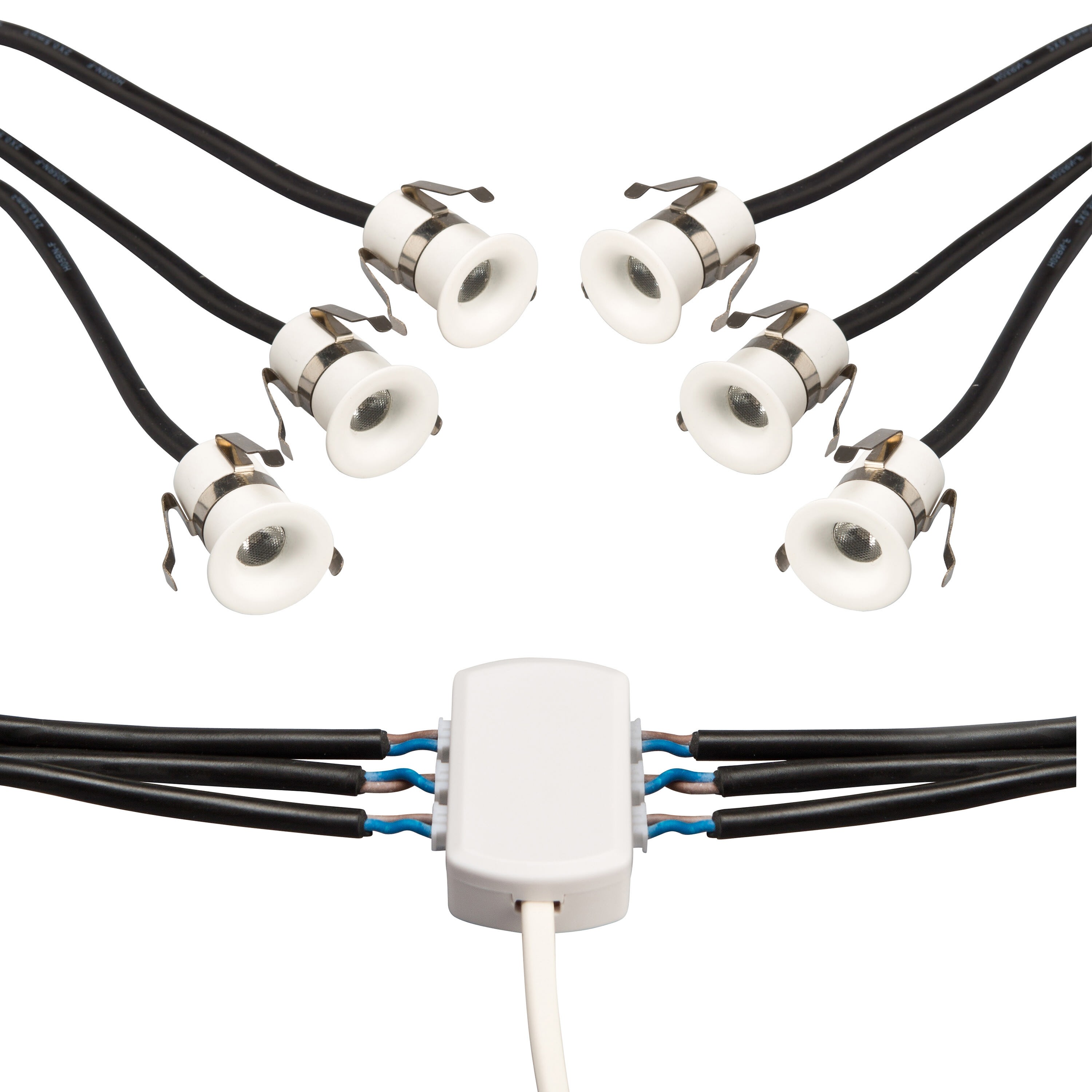 Encastré mur & plafond EUROPOLE BALI LED 2 rond, fixe, blanc, bleu 6x1,2W, optique diffusante symétrique 28°, 350mA. Classe de protection III, IP54, compatible isolants : non, câblé 1m + répartiteur 6 sorties, HO5RN-F 2x0,5mm². Durée de vie : 20000h. Dimmable : Non. Dimension collerette : diamètre 25mm. Diamètre d'encastrement : 22mm. Matériau : aluminium. Températures de fonctionnement : -20°C/+40°C. Walkover : Non. Le pack comprend 6 BALI LED, un répartiteur 6 sorties et une alimentation 350mA.