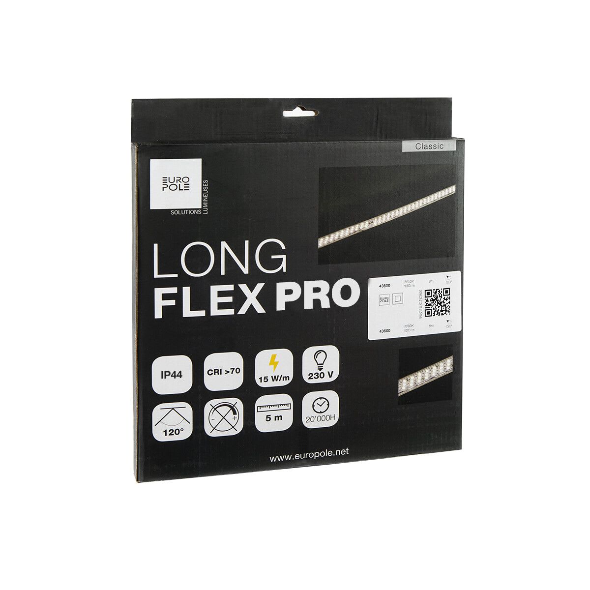 Pack bandeau LED EUROPOLE LONG FLEX PRO 5m blanc 3000K, IRC>80, SDCM5, 12W/m, 1100lm/m (92lm/W), 70LED/m, optique 120°, 230VAC, classe de protection II. Sécable tous les 200mm. IP44, compatible volume salle de bain : non, HO5RN-F, durée de vie : 20000h. Dimmable : Non. Installation sur profil aluminium ou via clips de fixation (non inclus). Forfait de montage IP65/67 impératif pour installation en zones humides et/ou en extérieur. Utilisation d'un adhésif double face préconisée. Le pack comprend un bandeau LED et un kit de connexion.