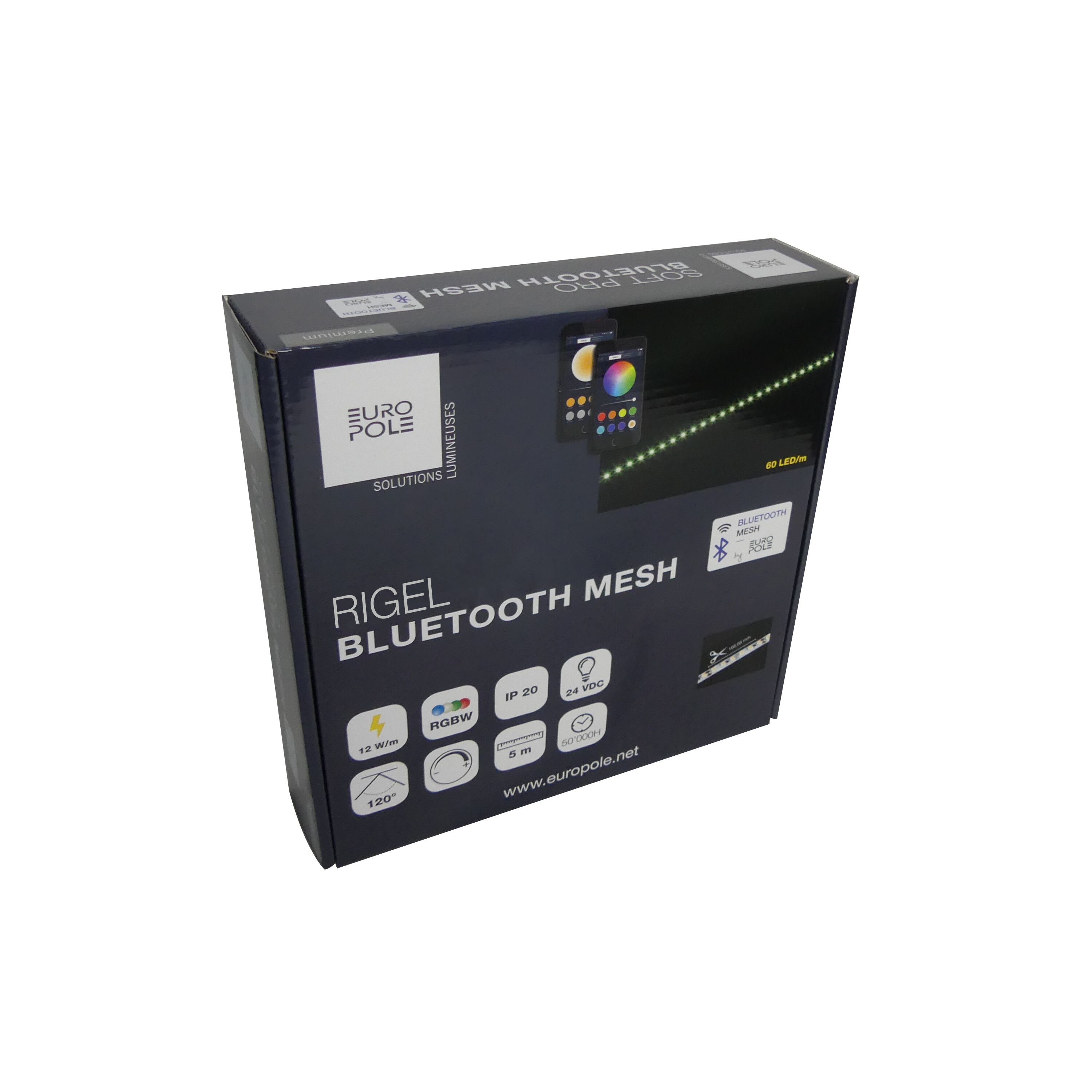 Pack bandeau LED EUROPOLE RIGEL IP20 - BLUETOOTH MESH 5m RGBW 4000K, IRC80, SDCM5, 12W/m, 806lm/m (67lm/W), 60LED/m, optique 120°, 24VDC, classe de protection II. Sécable tous les 100mm. IP20, compatible volume salle de bain : non, câblé de 1 côté 0,5m, 20AWG 5x0,5mm², durée de vie : 50000h. Dimmable : Oui, variation sans fil via application EUROPOLE BLUETOOTH MESH. Commande à distance : Oui. Installation sur profil aluminium impérative. Jusqu'à 240 contrôleurs synchronisés. Installation de 30m linéaire sans obstacle entre le premier et le dernier contrôleur. 10m max. entre chaque contrôleur. 10m max. entre le smartphone et le contrôleur. Protocole utilisé : Bluetooth Mesh. Interface de communication : via application EUROPOLE BLUETOOTH MESH ou télécommande Bluetooth MESH. Le pack comprend un bandeau LED, une alimentation, un contrôleur BLUETOOTH MESH et une télécommande.