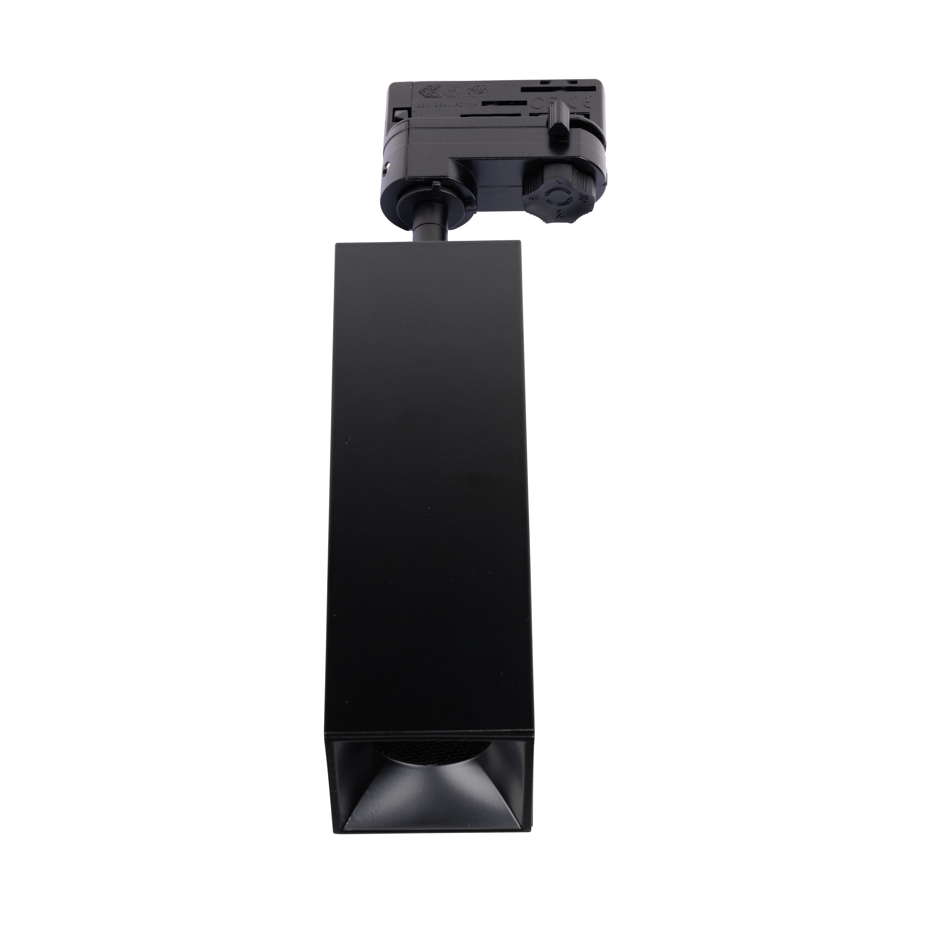 Plafonnier ANOVI UNIVERSAL BOXE RAIL LED carré noir mat. Monté avec LED'UP UNIVERSAL SWITCH blanc 2700K/3000K/4000K, IRC90, 6W, 500/525/600lm (88lm/W), nid d'abeille basse luminance 60°, 230VAC/27VDC. Durée de vie : 35000h. Dimmable : Oui, variation TRIAC. Classe de protection II/III, IP20, adaptateur pour rail triphasé, H05S-K. Mode de pose/installation : sur rail triphasé. Dimension : 66x66mm. Type de fixation : se visse sur le support. Matériau : aluminium. Températures de fonctionnement : -20°C/+40°C. Installation sous faux-plafond/sous plafond béton-brique-hourdis. S'adapte à vos envies grâce à sa déclinaison d'accessoires : de multiples possibilités de finitions d'anneaux.