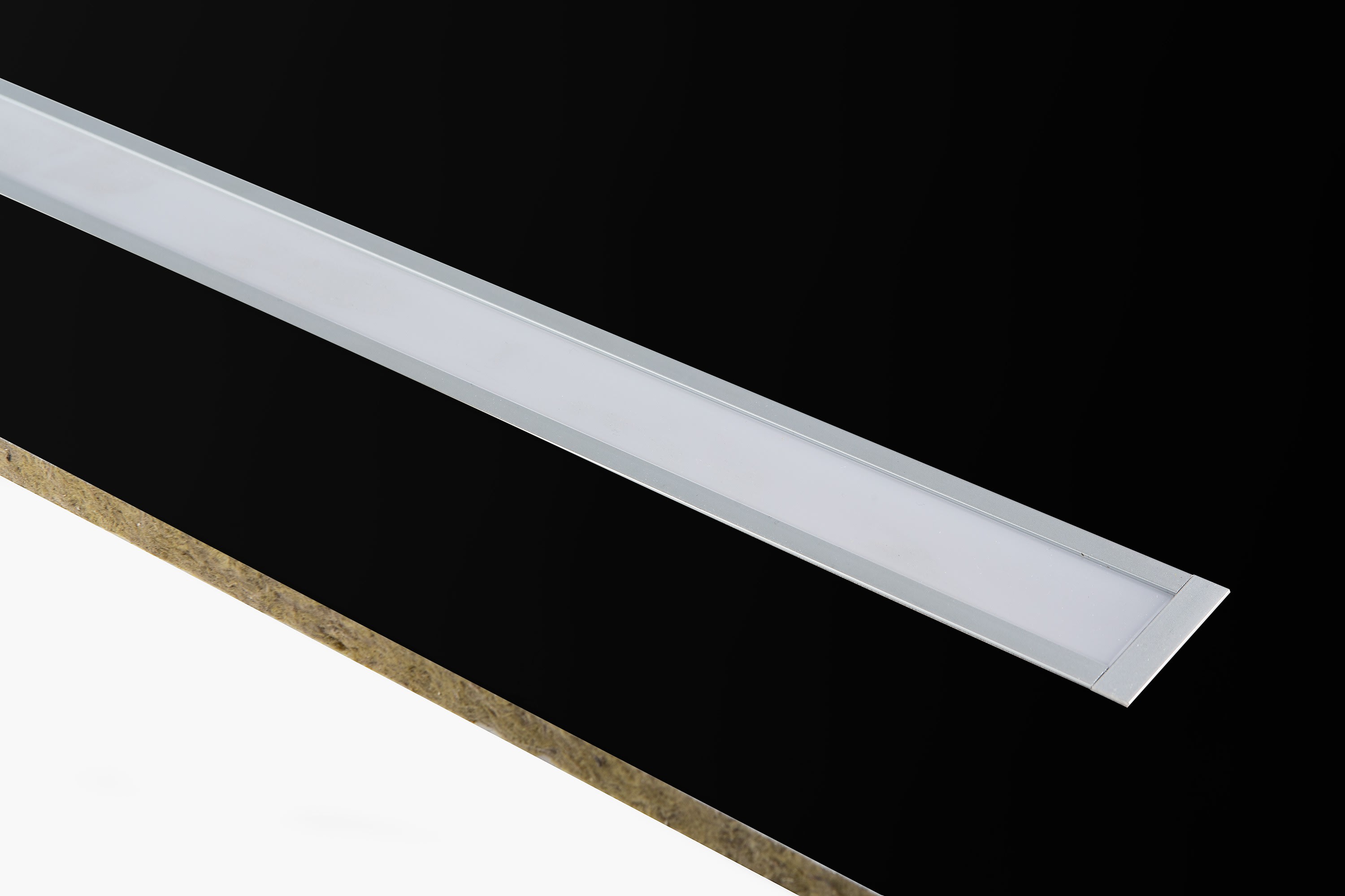 Profil LAZER R aluminium mat sur-mesure. Longueur maximum : 3,02m. Mode de pose/installation : encastré. Type de fixation : ressorts de fixation. Permet le maintien et la dissipation thermique des bandeaux LED.