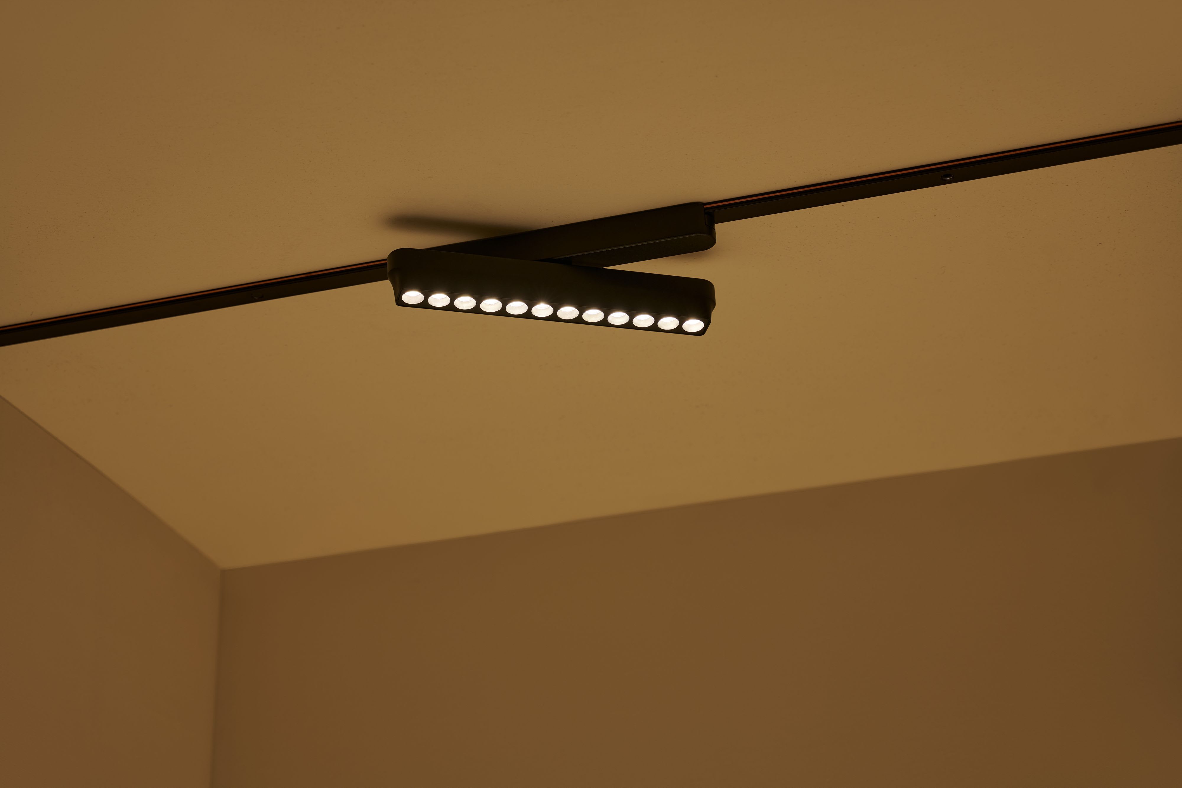 Réglette Led EUROPOLE MATYK LINEAR noir mat sur mini rail magnétique 48VDC, rotatif et orientable, blanc 3000K, IRC>90, 12W, 910lm (76 lm/W), optique faible éblouissement 36°. Classe de protection III, IP20, IK05, adaptateur pour mini rail magnétique 48VDC. Durée de vie : 30000h. Dimmable : non. Matériau : corps en aluminium. Traitement de la surface : sans traitement. Utilisation : intérieur. Températures de fonctionnement : -20°C/+45°C. Mode de pose/installation : sur mini rail magnétique 48VDC.