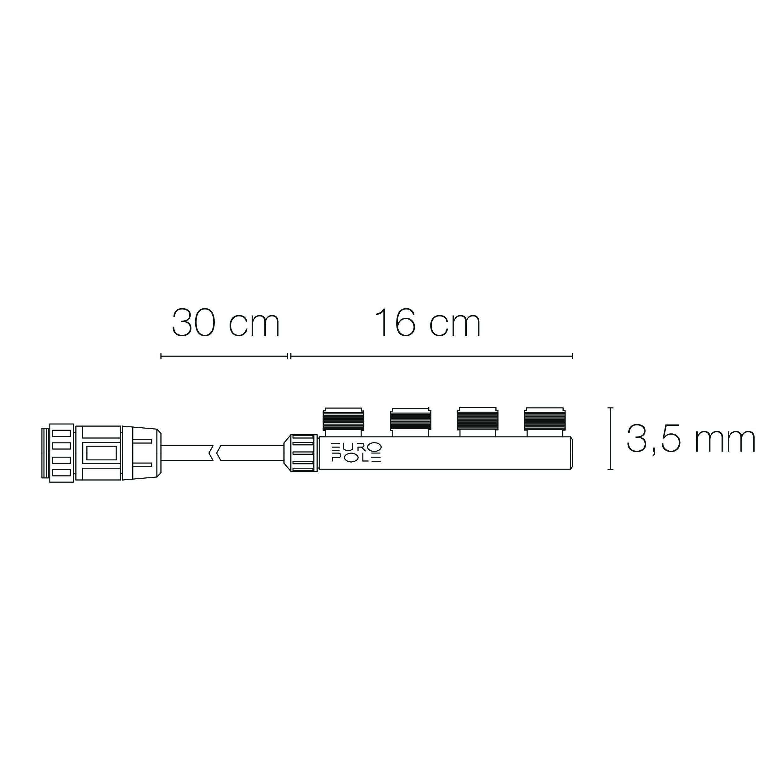 Solution PLUG & PLAY by EUROPOLE : Répartiteur 4 sorties 2 pôles IP67. Compatible avec les produits extérieurs équipés de connectiques IP68 M/F. Câblage : câblé de 0,3m, HO5RN-F 2x1mm²
