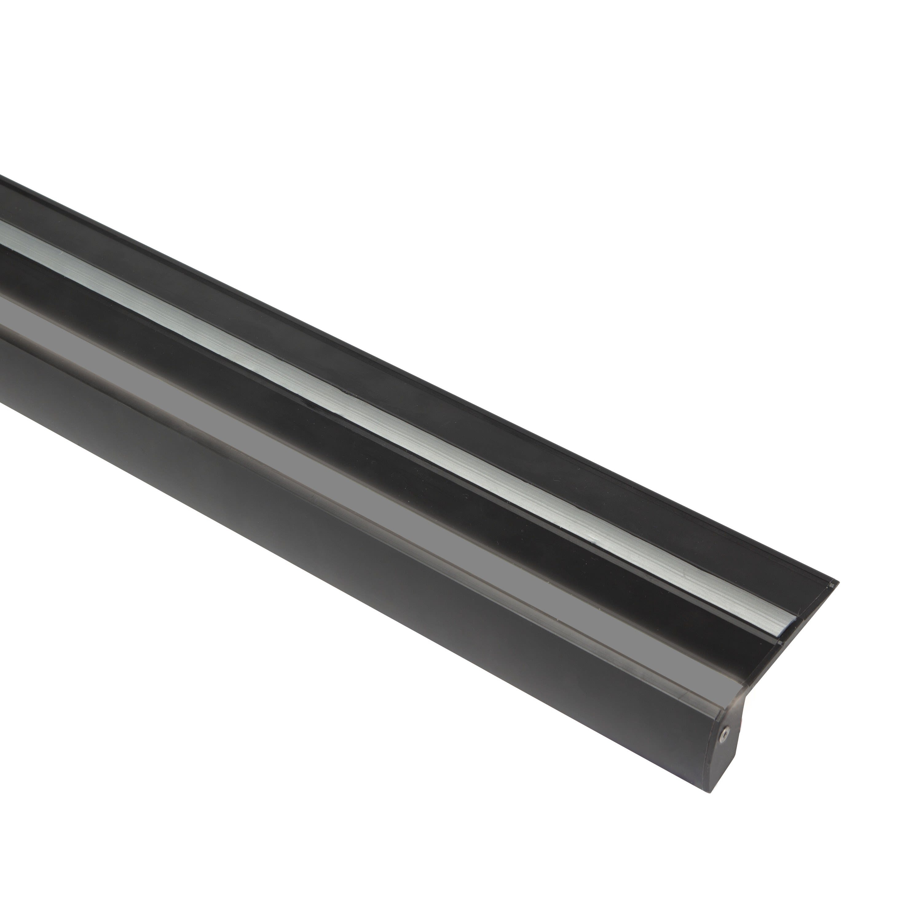 Nez de marche LED EUROPOLE sur-mesure au centimètre SHARK STEP noir, éclairage bas : résine transparente, blanc 3000K, IRC90, SDCM3, 4,8W/m, 369lm/m (77lm/W), 128LED/m, optique , 24VDC. Bandeau utilisé : VOLTA PRO 4,8W/m. Classe de protection III, IP68, IK10. Compatible volume salle de bain : 1. Longueur maximum d'un seul tenant : 3,01m, câble non fourni : à compléter avec références de forfait de câblage et câble, contacter le service clients au 04 72 49 80 49. Dimmable : oui, variation avec alimentation/contrôleur compatible (non inclus). Matériau : aluminium/caoutchouc. Résistance environnement : UV/solvants/abrasion/garantie corrosion 15 ans. Durée de vie : 30000h. Températures de fonctionnement : -20°C/+60°C. Walkover : oui. Driveover : non. Mode de pose/installation : nez de marche. Installation avec bandes antidérapantes (incluses). La réglette se visse directement sur le support.