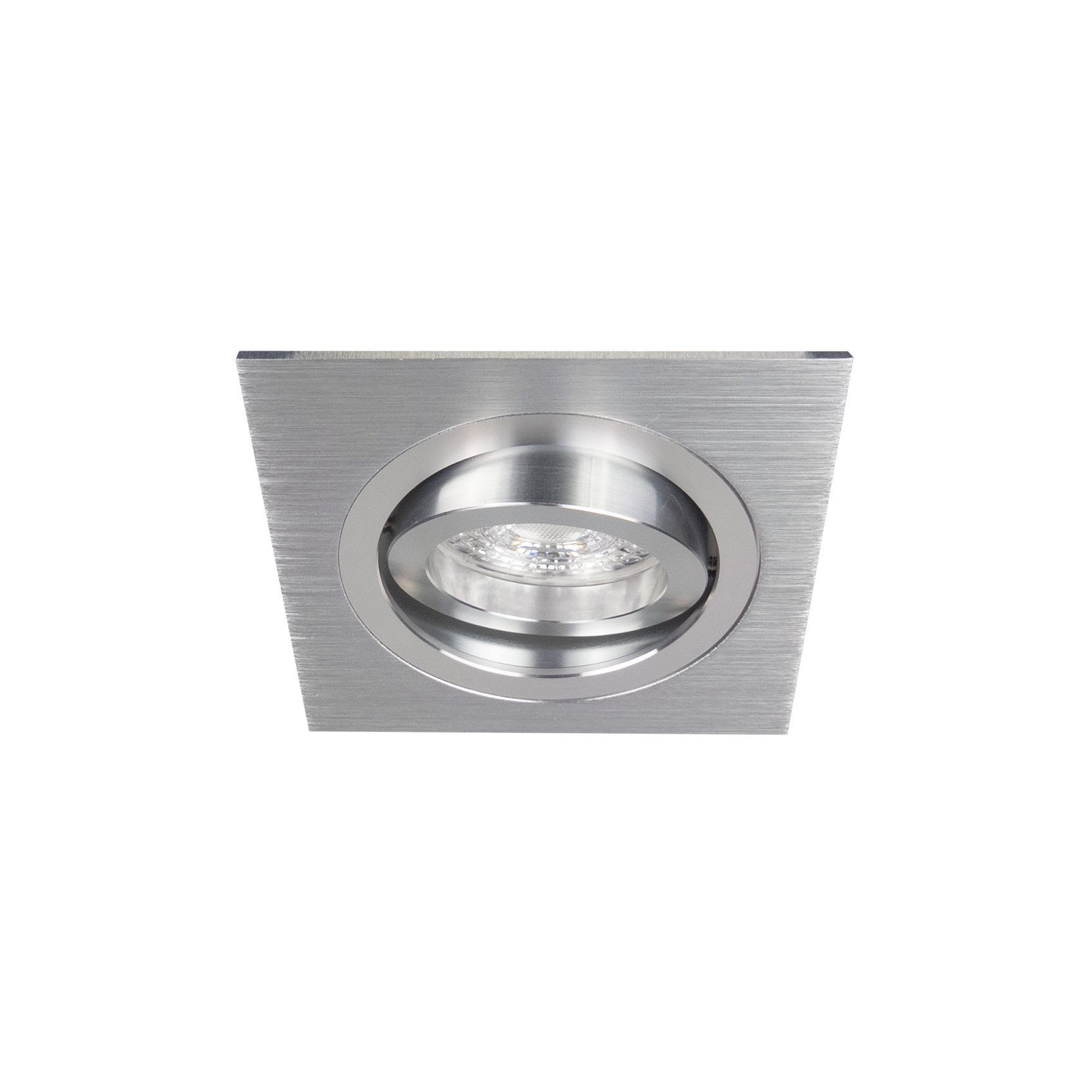 Spot EUROPOLE ALU 16 carré 1 tête orientable, aluminium brossé/aluminium poli, diffuseurs opale et transparent/nid d'abeille basse luminance, 230VAC, GU10, classe de protection II, IP20, compatible volume salle de bain : non, compatible isolants : non. Dimension collerette : 92x92mm. Diamètre d'encastrement : 80mm. Patère rapide incluse : Oui, kit optiques spoterie inclus : non. Températures de fonctionnement : -20°C/+40°C. Fixation de la lampe par bague. Livré avec douille GU10 pré-connectée. Pour lampe LED 6W max. (non incluse).